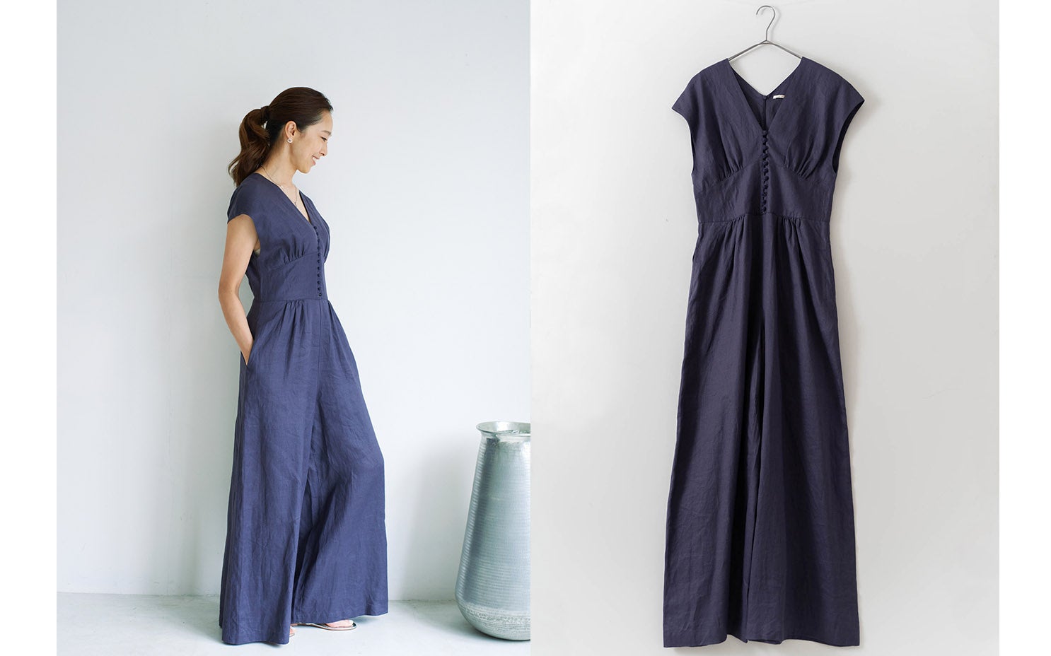 立った時のシルエットが特に美しいオールインワンは、ドレスアップしたいシーンやディナーにもおすすめ。ウエスト部分はキュッと締まり、腰回りから裾にかけてはバギーパンツのように身幅にゆとりがあるデザインで、スタイルアップ効果も期待できます。