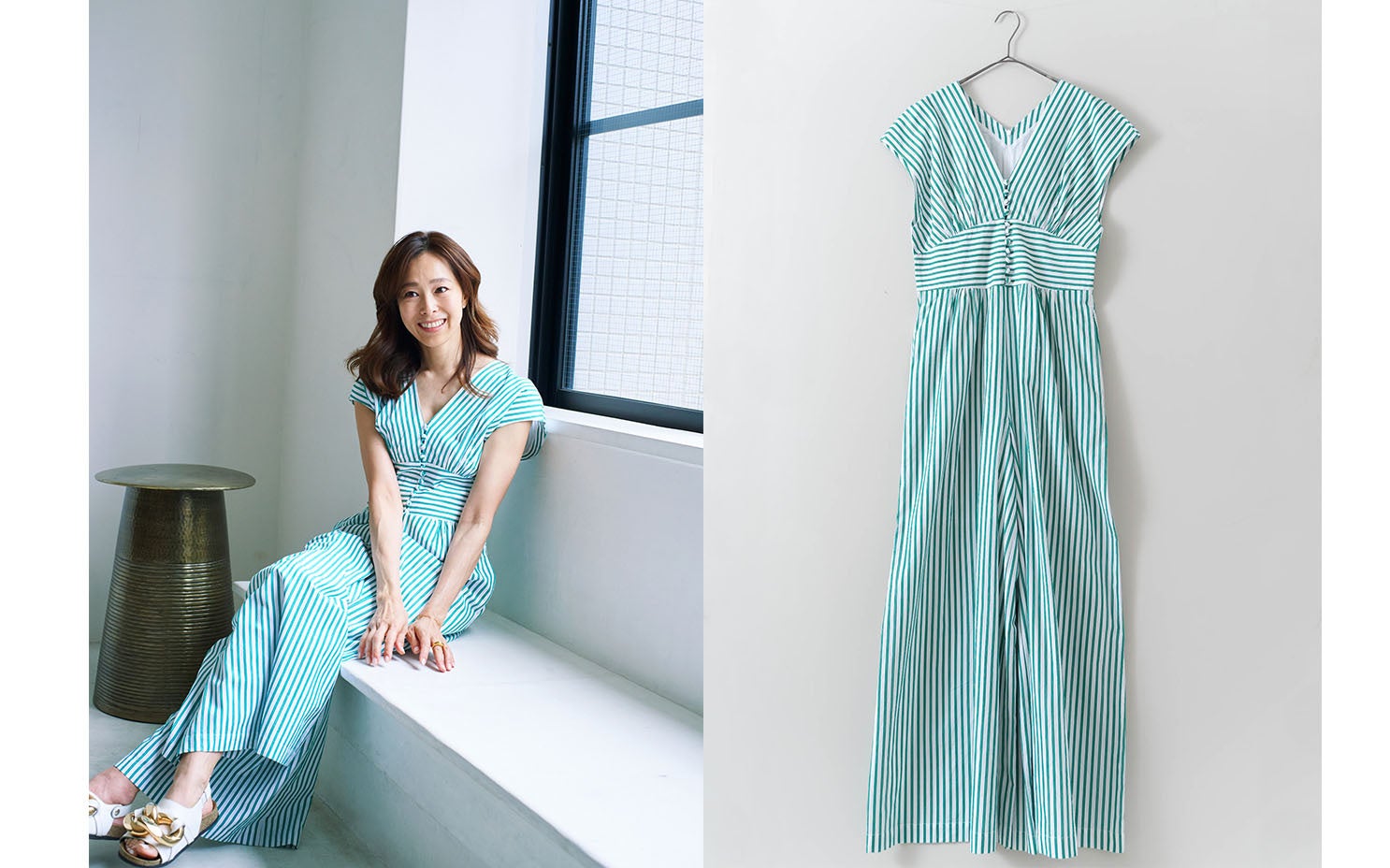 〈COTTON STRIPE V NECK ALL IN ONE (GREEN) ¥33,000〉