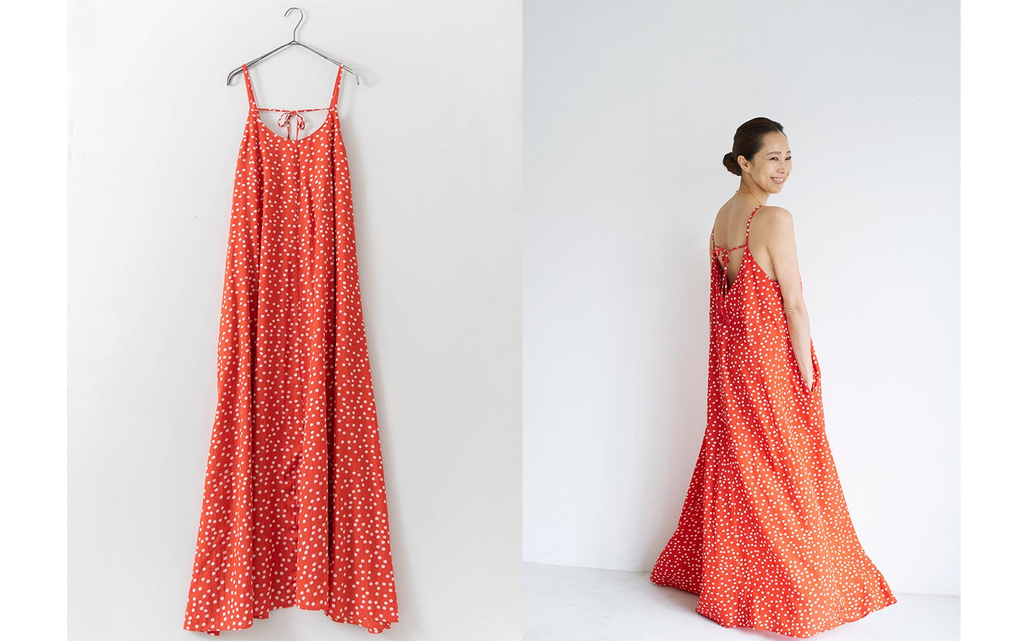 背中が大胆に開いたキャミソールワンピースは、インナーとのレイヤードを楽しめる一着。鮮やかなレッドは太陽の光とも相性抜群で、夏に大活躍するアイテムです。