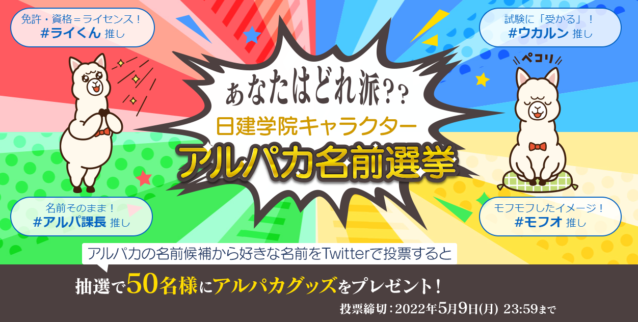 資格取得支援スクールの日建学院を運営する株式会社建築資料研究社(所在地:東京都豊島区、代表取締役社長:馬場栄一)は、Twitterにおいて日建学院キャラクター「アルパカ」の命名キャンペーンを2022年5月9日(月)まで実施中です。