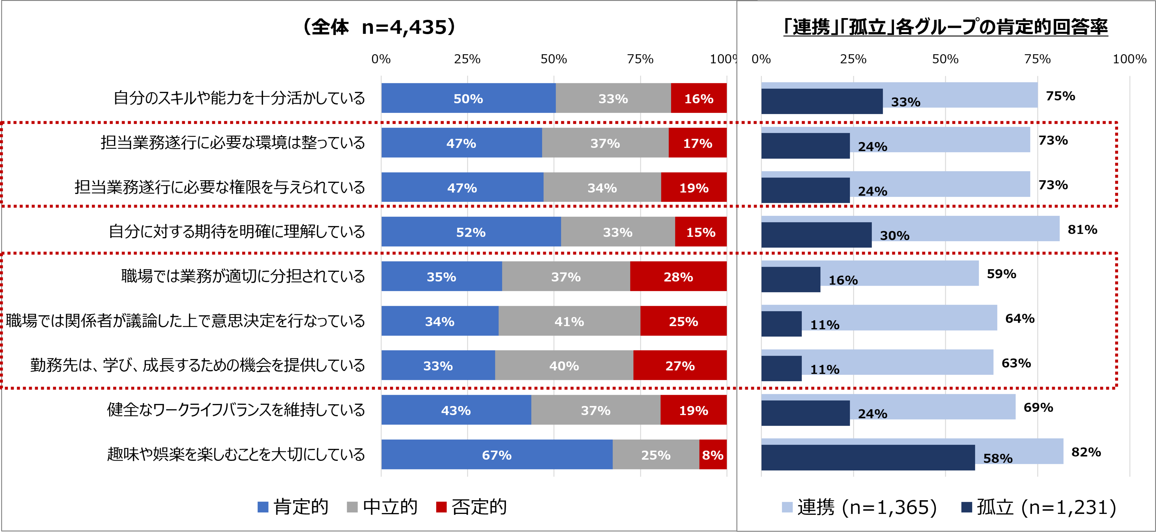 本調査は、現在日本で働いている人を対象(性別・年代別で労働人口分布に沿って割付け)に2021年10月20日〜22日にかけて、インテージ社のアンケートモニターに対して実施しました。有効回答は4,435人でした。設問設計には、埼玉大学経済経営系大学院の宇田川元一准教授にもご協力いただきました。分析に当たっては、図表1の設問項目に対する回答の平均点が、全体の上位25%以上に含まれる回答者を「連携グループ」、下位25%以下に含まれる回答者を「孤立グループ」と分類しました。