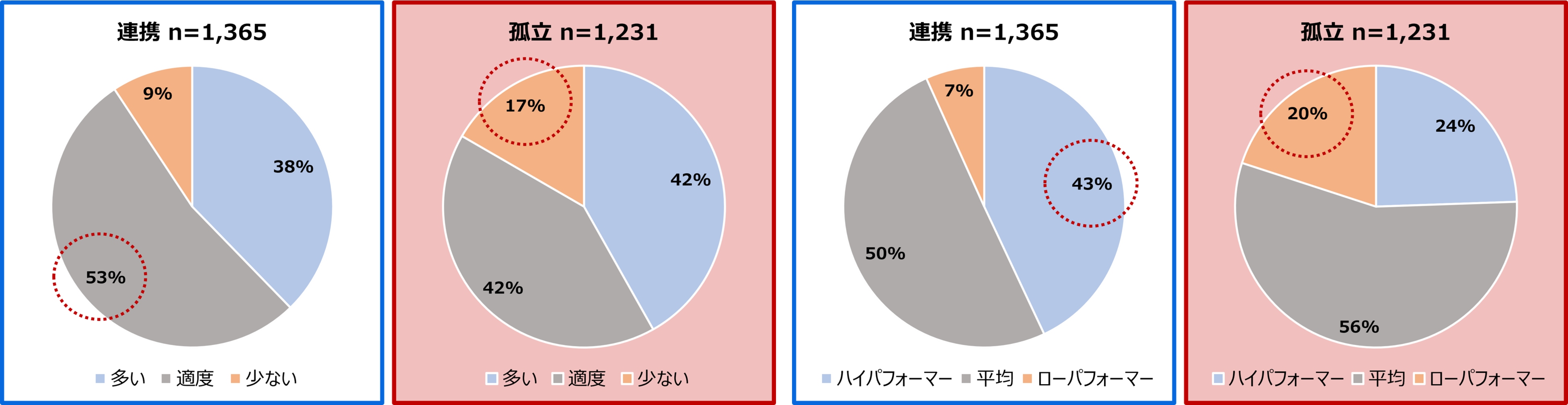 さらに、「孤立グループ」の特徴として、業務分担の適切さ、関係者の議論に基づく意思決定のほか、職場において学び・成長する機会などに対して肯定的に捉えている回答者がわずか10%台にとどまっています。また、担当する業務量が少ない、自身の業績組織の平均以下とした回答者でみても、「孤立グループ」の方が高い比率となっています。一言でいえば、周囲との連携が弱い分、十分な仕事が回ってこなかったり、あるいは一人で仕事を抱え込んで、もがきながら業務を遂行しているような状態が発生しやすいと捉えられます。