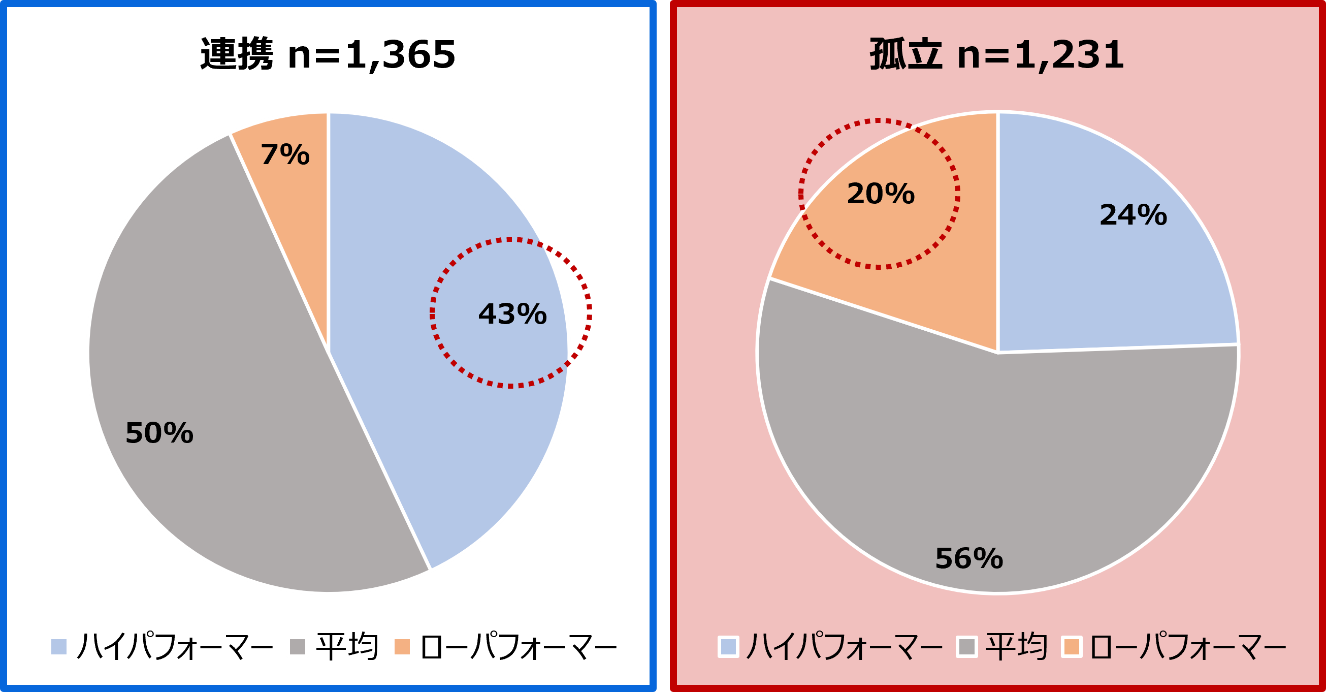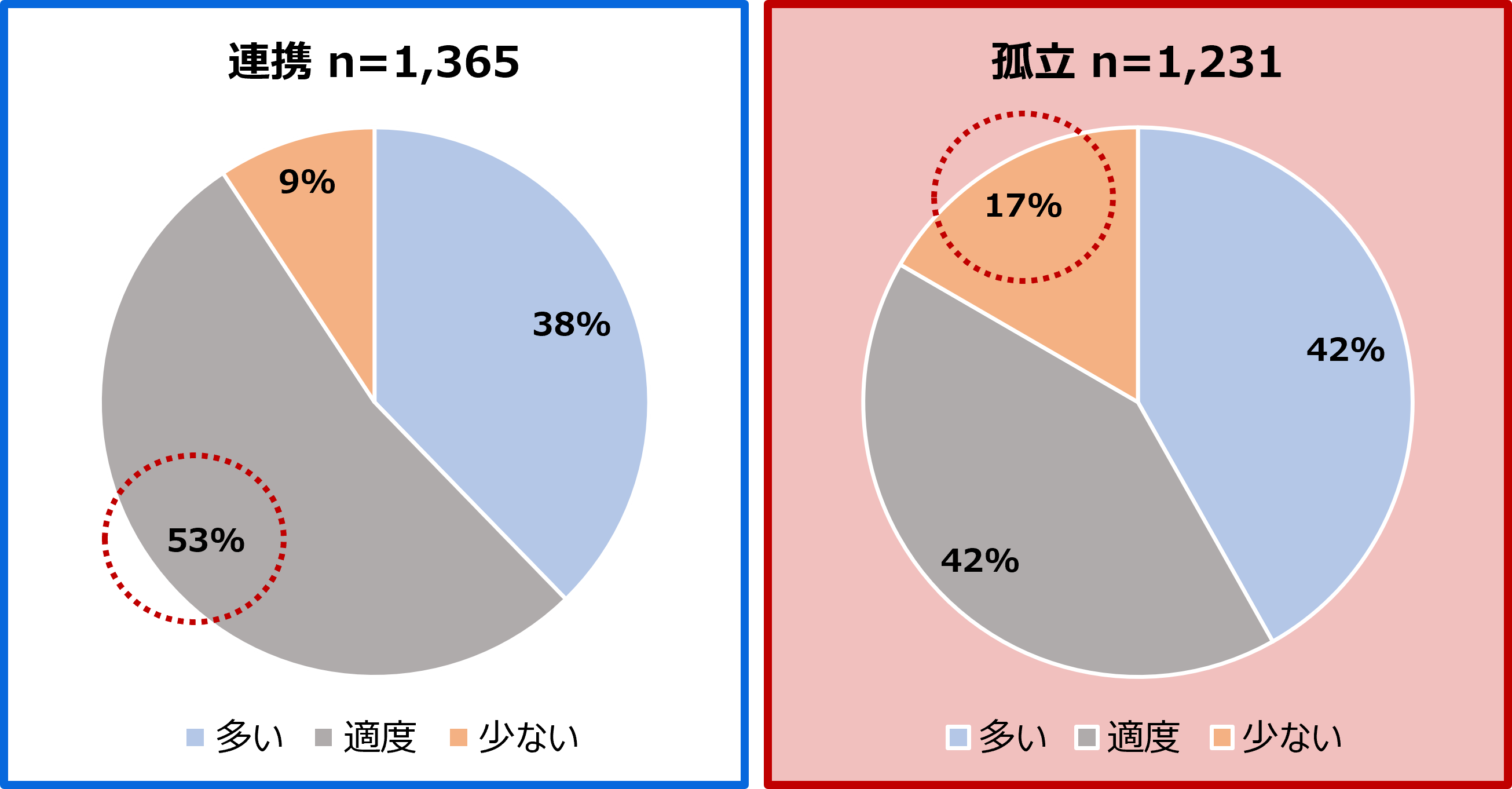 しかし、実際には、「孤立グループ」出社勤務をしている回答者の比率が「連携グループ」よりも高めになっていました。この原因については、さらに深い分析が必要になると思われますが、ここで重要なメッセージは「出社して単に空間と時間を共有するだけでは、職場における孤立は解消されない可能性が高い」という点です。職場に出社していても、周囲との連携度合いは各自の働き方や業務内容に応じて異なるためです。