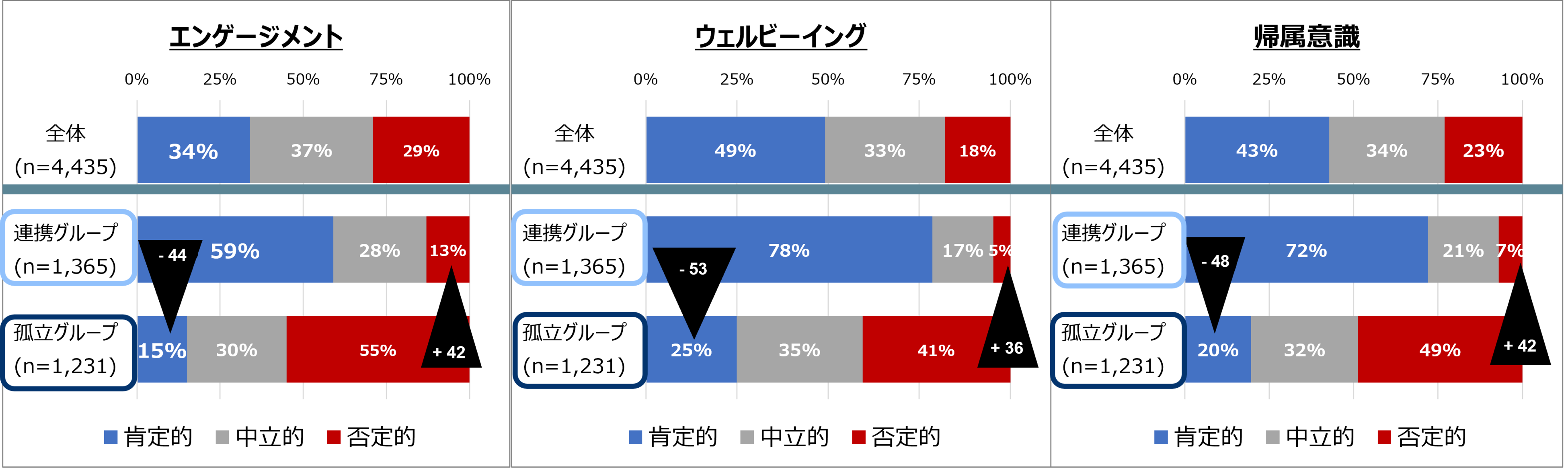 次に、昨今のHR分野における重要指標と考えられるエンゲージメント、ウェルビーイング、帰属意識に関し、弊社が標準とする設問項目に基づいて「連携グループ」と「孤立グループ」の回答を集計したところ、いずれも「孤立グループ」の水準の低さが顕著であることが示されました。人との繋がりが希薄化すると同時に、組織に対する帰属意識が低下することはもちろん、心身の健康やエンゲージメントまでも低い水準にことは、注目に値する結果であるといえます。