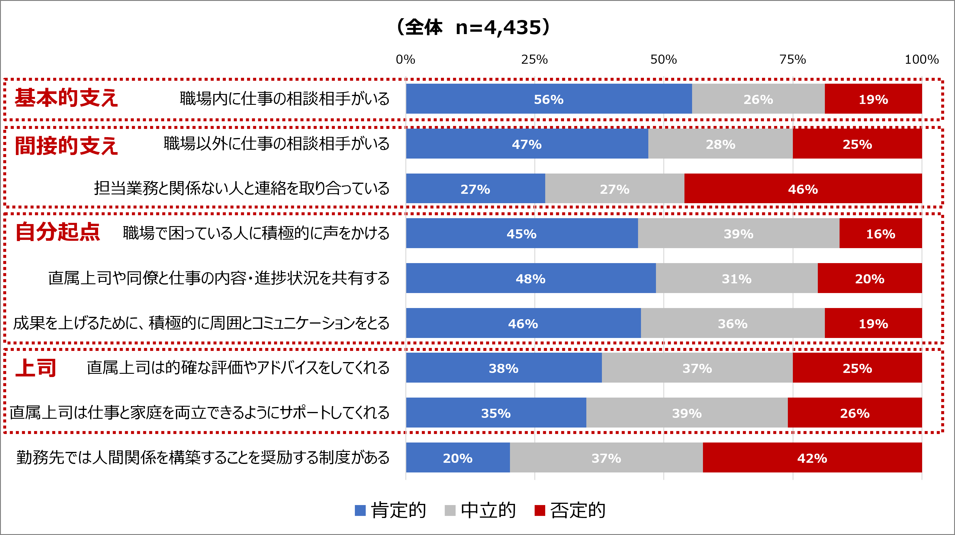 本調査においては、まず仕事を通して日常的にどの程度周囲と接点を持っているのかを多面的に尋ねました。56%が職場に仕事上の相談相手がいるとした一方、より広い繋がりとして職場以外にも相談相手がいたり、自分から積極的に他者に働きかけるとした回答者は5割に満たない水準でした。さらに、仕事上で密なコミュニケーションが発生するはずの直属上司についても、彼らからのアドバイスやワークライフバランスへのサポートを肯定的に捉えている回答者は全体の4割未満に過ぎません。勤務先が社内の人間関係を強化するような施策や制度を導入しているとした回答者に至っては、2割に留まります。全般的には、仕事を通した人の人との繋がりはどちらかといえば弱いと解釈することができます。