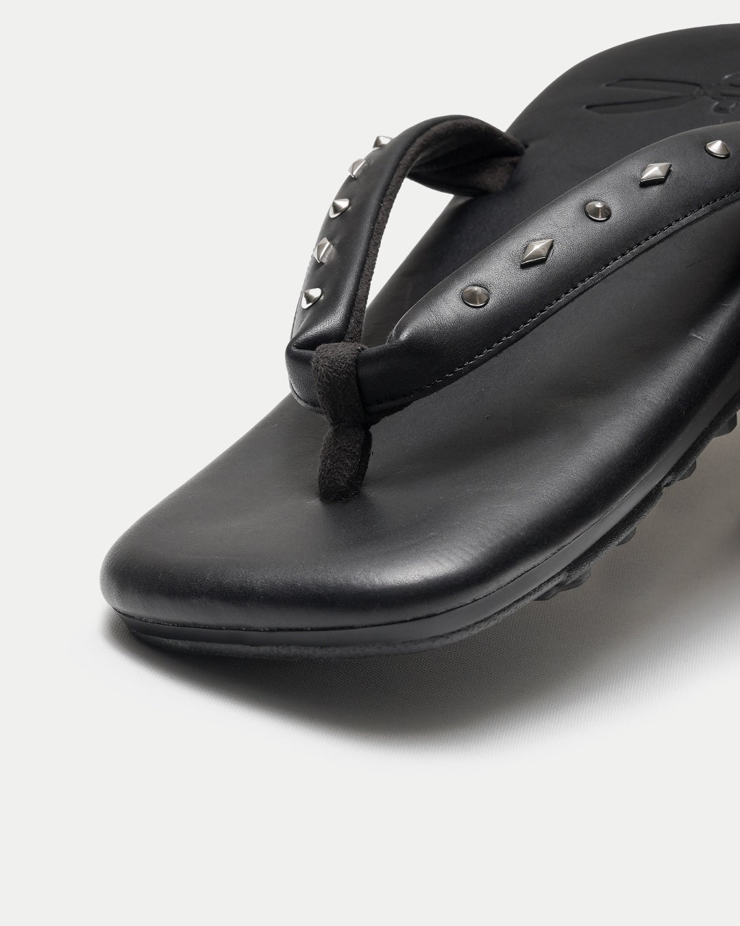 パーからソールまで全体をオールブラックでまとめ、鼻緒のスタッズがコーディ