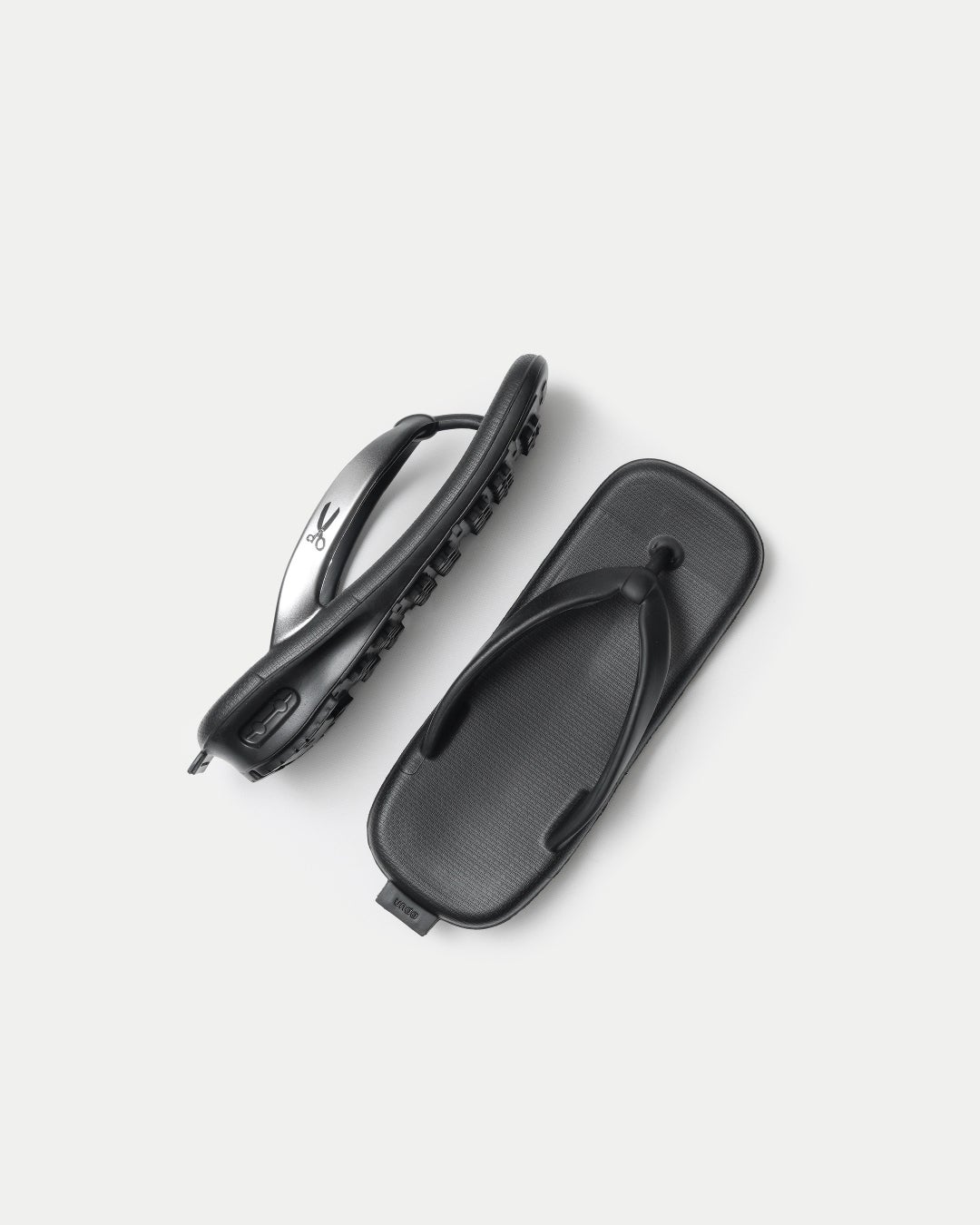一体成形技術により耐久性と耐水性を高めた新ライン「unda EVA」もコラボデザインとなって新発売。シルバーのメタリックスプレー加工が施された鼻緒にはブランドを象徴するシザースマークが配されている。