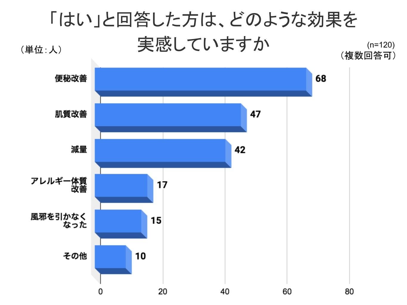 - 半数以上の68名(56.7%)の方が「便秘改善」の効果を実感しているようだ