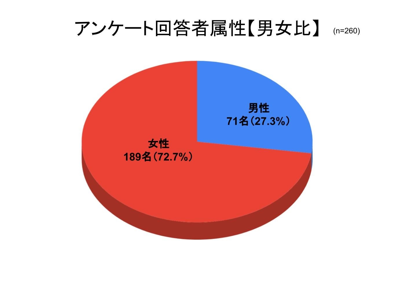- 男性:71名(27.3%)、女性:189名(72.7%)