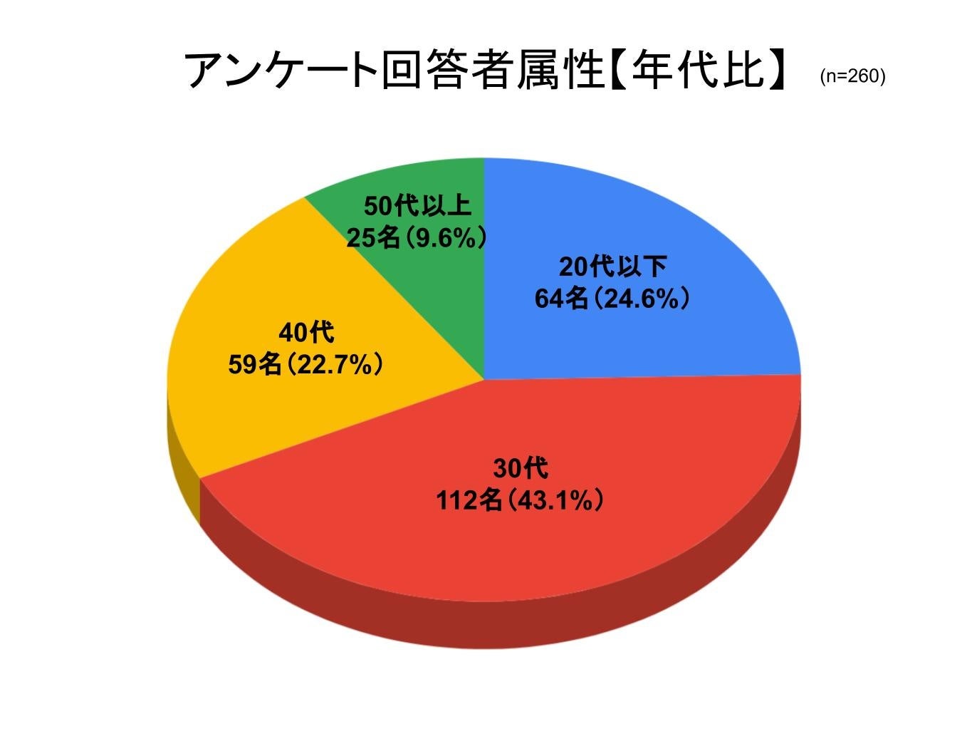 - 20代以下:64名(24.6%)、30代:112名(43.1%)、40代:59名(22.7%)、50代以上:25名(9.6%)