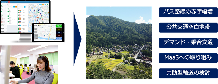 全国38都道府県のタクシー事業者へ導入されている「クラウド型タクシー配車システム」を、より地域公共交通に必要な形に応用し、以下のようなソリューションを通じて地域の移動課題解決を支援しています。