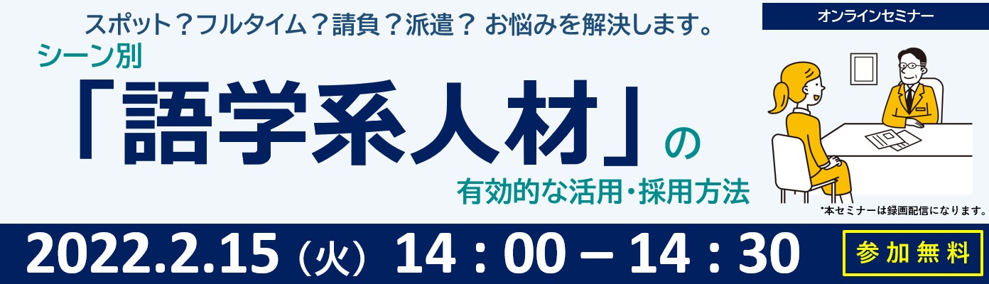 【2/15開催】 スポット?フルタイム?請負?派遣?『シーン別語学系⼈材の有効的な活⽤・採⽤⽅法』無料オンラインセミナー