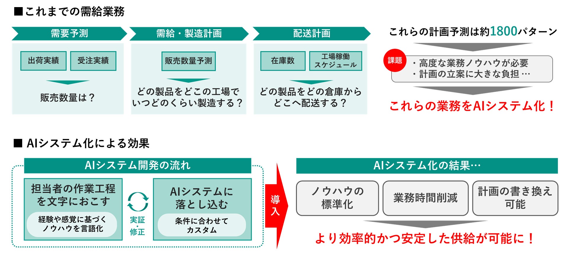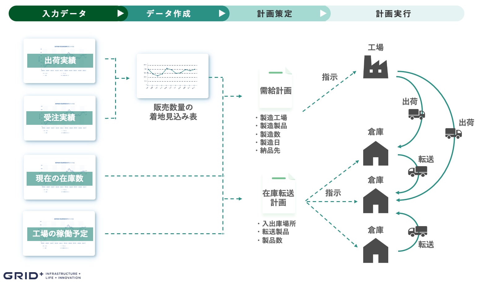 こうした背景の中、日清製粉ウェルナが培った高度な業務ノウハウと、グリッドのAI技術を組み合わせ、需給管理の自動化システムを開発しました。今回開発したシステムでは、需給計画(製造計画)および在庫転送計画の自動策定が可能となりました。