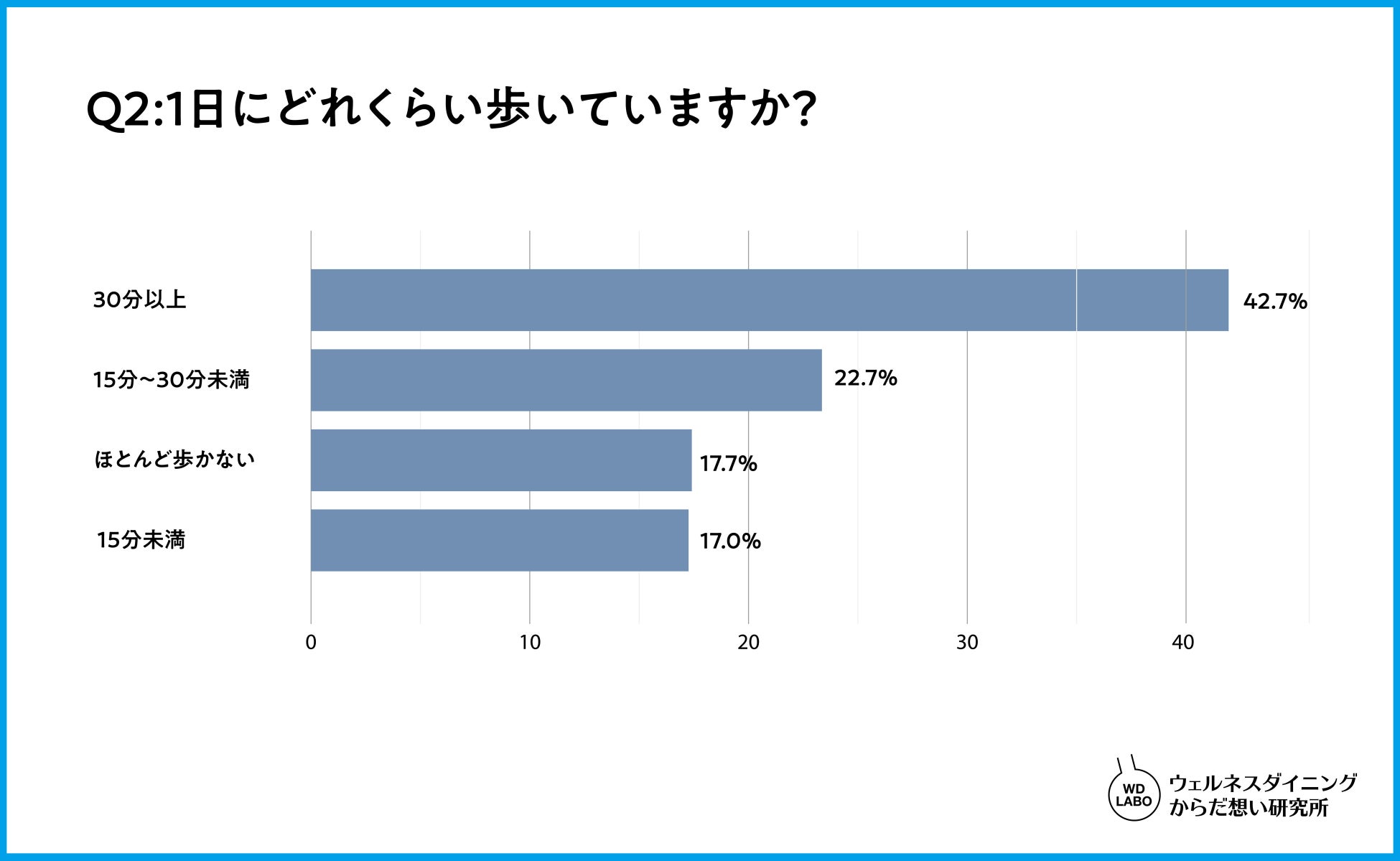 「15分未満の歩行」17.0%と「ほとんど歩かない」17.7%、さらに「15分〜30分未満」22.7%を合わせると、半数以上(57.4%)の方が1日30分未満の歩行量にとどまっていることが判明。