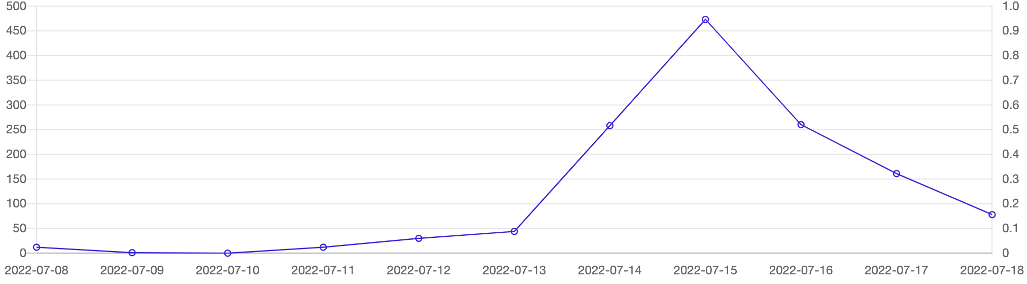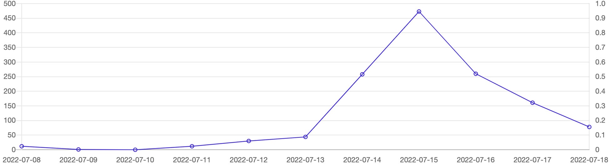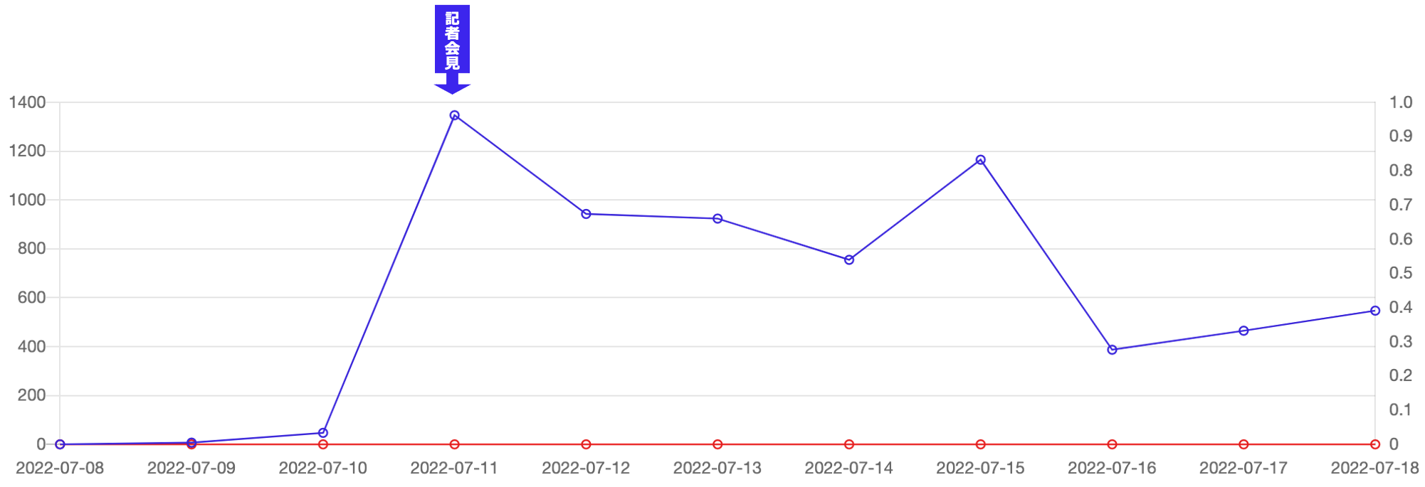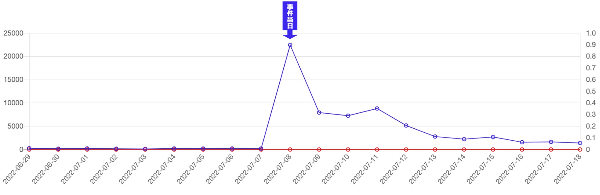 1日に22,460記事という数は巨大です。たとえば現役の岸田首相の6月半ばから1ヶ月の記事数は45,284。今回の事件は、1日に岸田さんのほぼ2週間分の報道を生んだことになります。