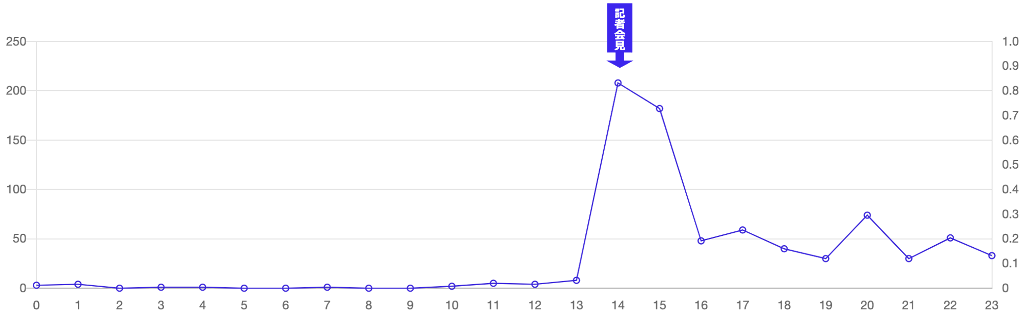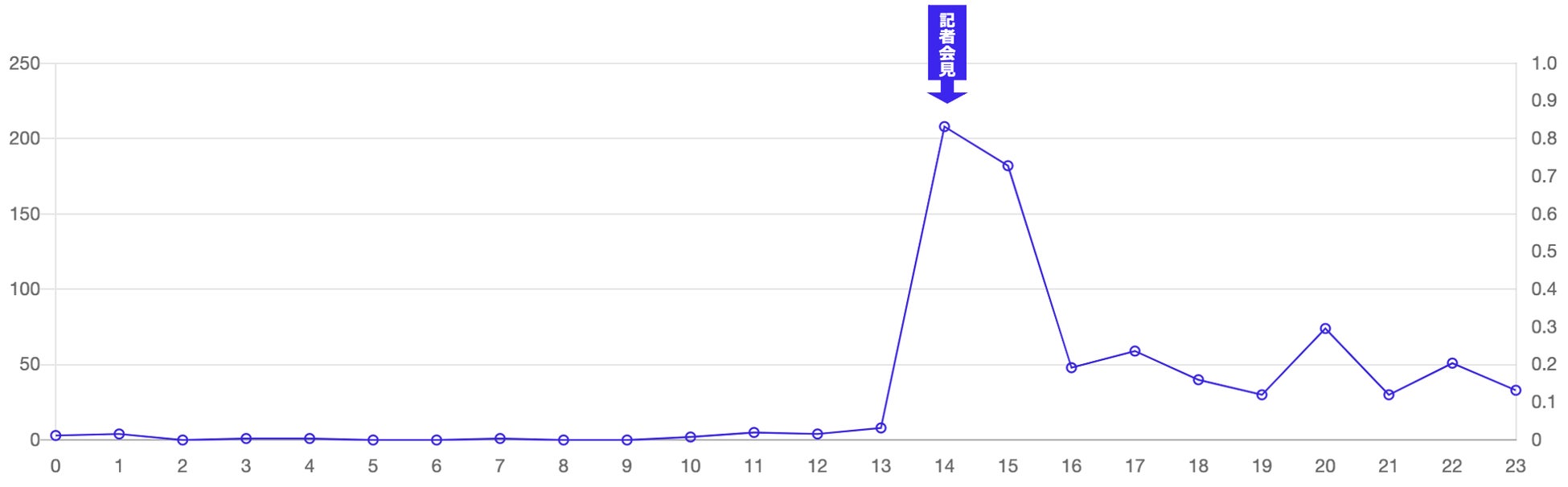 その後安倍さんの死去が発表されてから、著名人や国内外の要人による追悼コメントが出され、19時から20時台に次のピークが来ています。