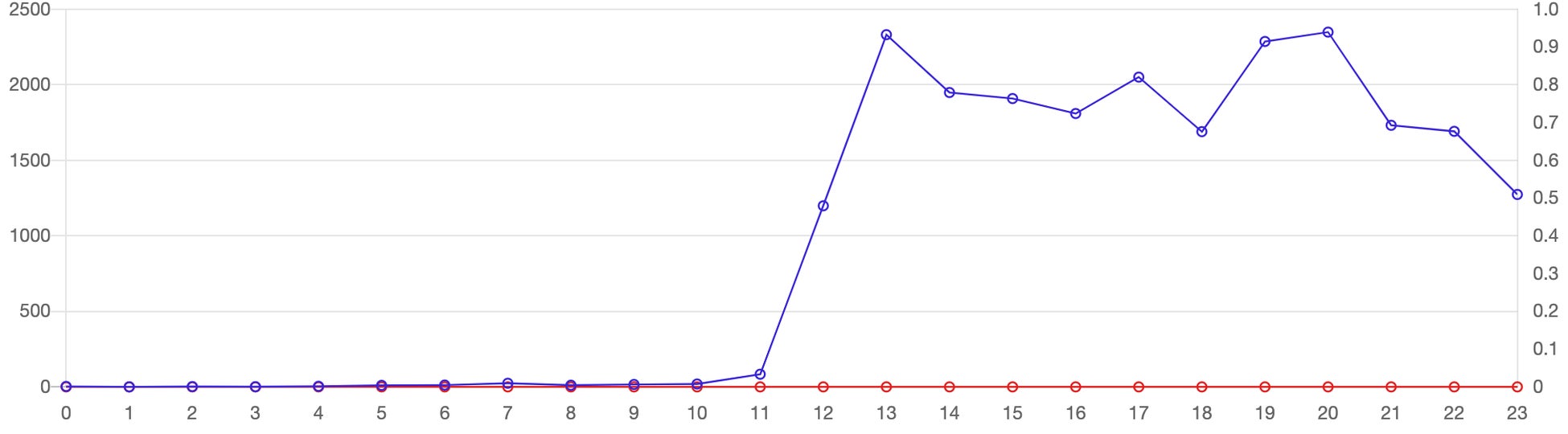 8日の内で時間ごとの記事数推移を見ると、事件直後の12時から13時にかけて最初のピークが来ています。