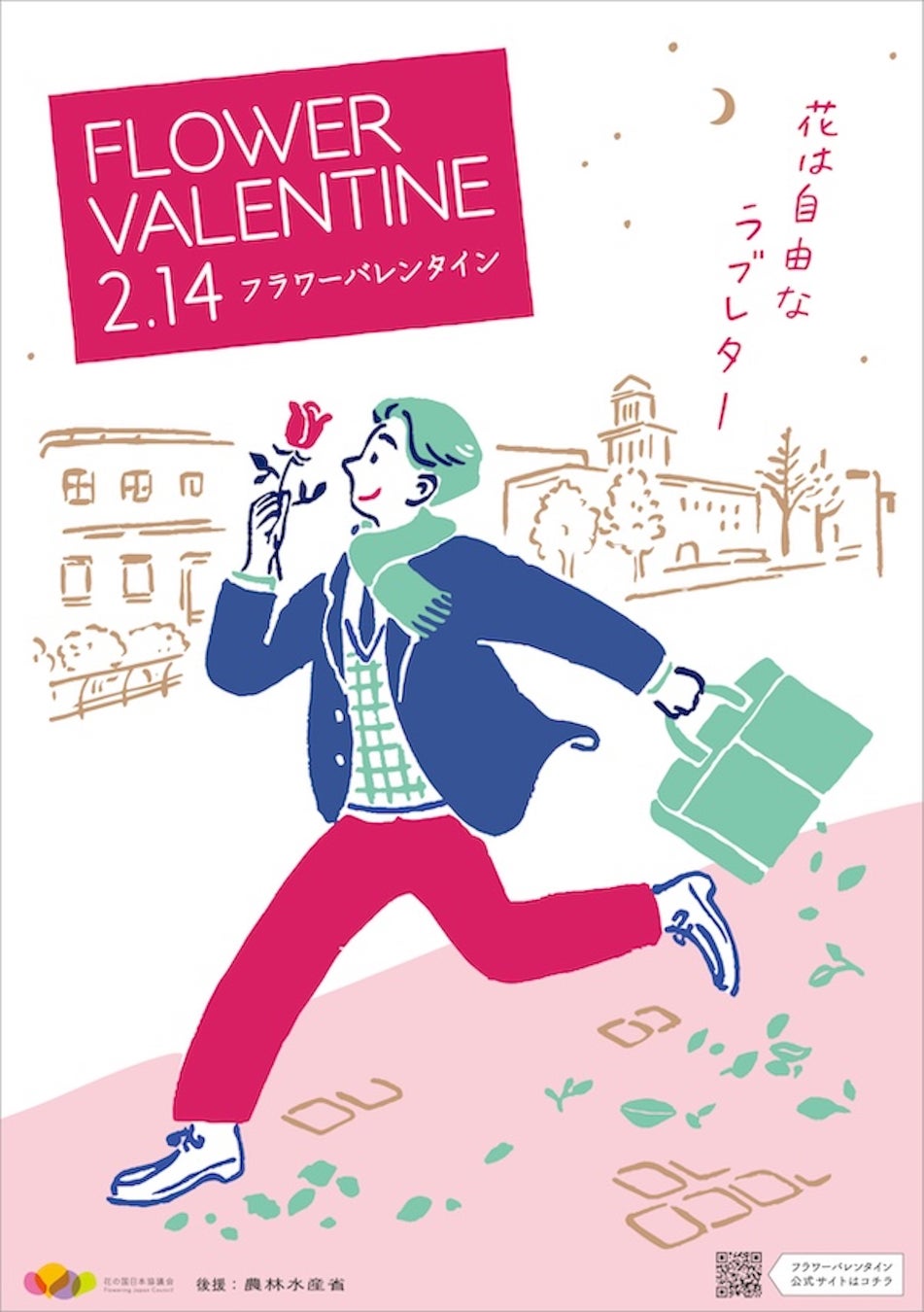 フラワーバレンタインのビジュアルは、花を片手に相手の喜ぶ笑顔を想像しながら弾むような足取りで歩く様子をイラスト化、花を贈る際のウキウキワクワクする気持ちを表しました(イラスト:MIMOE)。