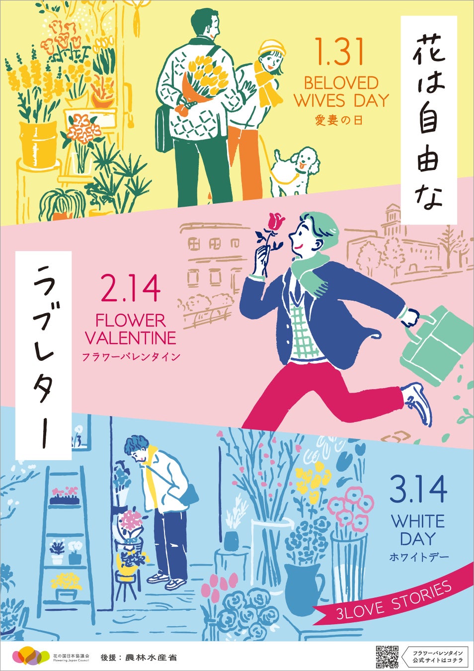 「フラワーバレンタイン」とは、こうしたバレンタインデーの素敵な風習にならい、大切な人に愛や感謝の気持ちをこめて花を贈るきっかけを作り、花贈りを応援するプロモーションです。さらに、バレンタインデー前後の1月31日「愛妻の日」、3月14日「ホワイトデー」を含め「3LOVE STORIES」と表現し、1月~3月には花贈りのチャンスが3回あることを全国の花店からお客様へアピールしています。
