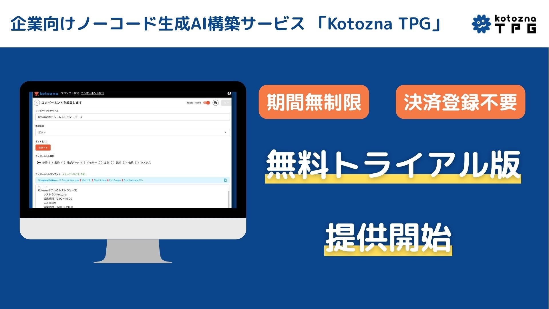 Kotozna株式会社(本社:東京都港区、代表取締役 後藤玄利、以下Kotozna)は、ノーコード型の生成AIチャットボットプラットフォーム「Kotozna TPG(Tailored Prompts Generator)」の無制限無料トライアル版を2025年7月8日(火)より提供開始いたします。これにより、期間制限や決済方法の登録なしで、誰でも自分のペースで「Kotozna TPG」の機能をテスト・体験いただけます(非商用利用に限る)。Kotoznaは、「誰もが高性能な生成AIチャットボットを構築できる世界」の実現に向け引き続き、利便性の高いサービスを追求してまいります。