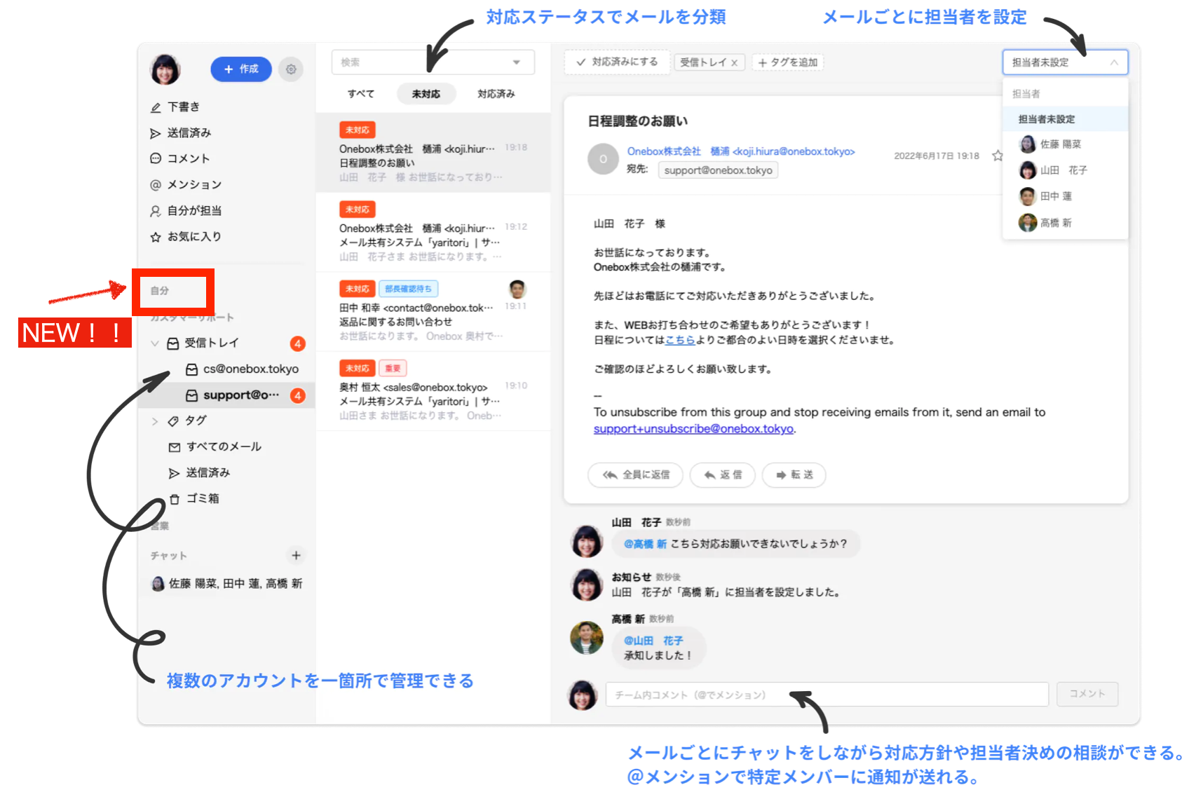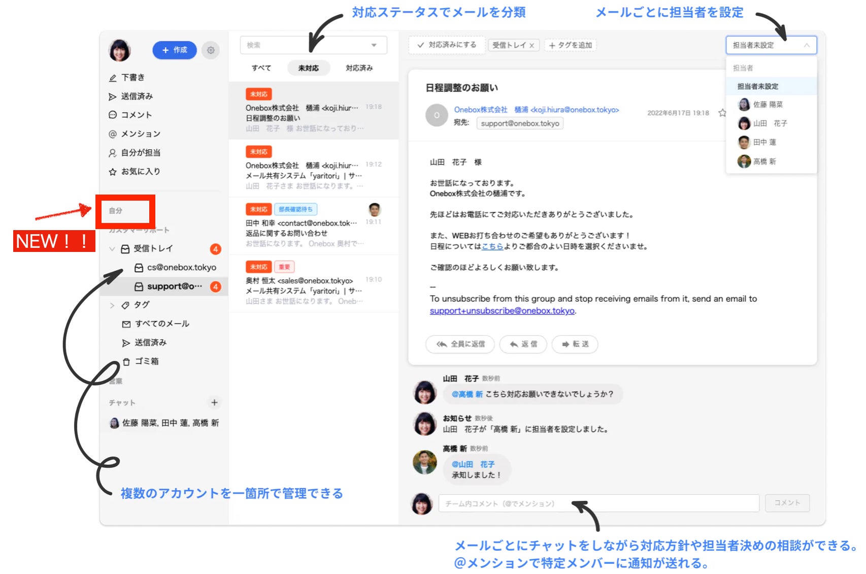 「suppot@」「sales@」などの共有アドレスに加え、ユーザーごとの個人アドレス(yamada@など)も管理できるようになりました。これにより、全てのメールアドレスを「yaritori」で管理できるようになり、gmailやoutlookを併用する必要がなくなります。