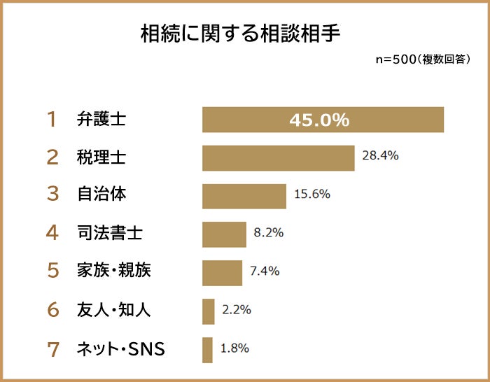 最後に、「相続の問題が生じた場合、誰に相談しますか」と聞いたところ、1位は「弁護士(45.0%)」で、半数近くを占めました。