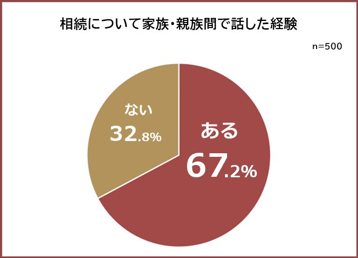家族・親族の相続について考えたことがある500人に、「実際に、相続について家族・親族と話したことがあるか」聞いたところ、「ある」と答えた人が67.2%で7割近くという結果に。