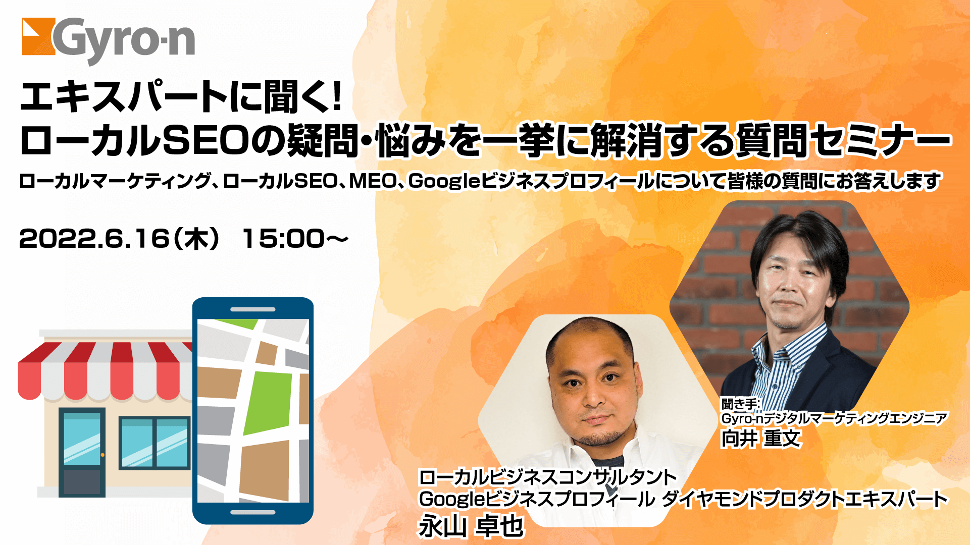 店舗のオーナー様、マーケティング担当者様、ローカルビジネスを支援される事業者の方は、ローカルSEO(MEO)といったオンラインの施策のみにとどまらず、オンライン/オフライン両方を見据えた施策の実施や、そのための知識の整備、ノウハウの構築を進めていく必要があります。 Gyro-nではローカルSEOの観点から店舗ビジネスの事業者に向けて新たにスポットコンサルティングサービスの提供を開始、Googleビジネスプロフィール ダイヤモンドプロダクトエキスパートで知られるローカルビジネスコンサルタントの永山卓也氏をその顧問に迎えました。 今回のセミナーイベントは、ローカルビジネスに関連する業務に取り組まれている皆様がお持ちの、MEO、ローカルSEO、Googleマップ/ビジネスプロフィール、ローカルビジネスに関する疑問、質問に、永山卓也氏がお答えする、質問だけのセミナーです。 聞き役は、Gyro-n MEOの設計者であるGyro-nデジタルマーケティングエンジニアの向井重文が務め、向井の観点やGyro-nでの事例などを交えて皆様の疑問を深掘りして永山氏に質問していきます。