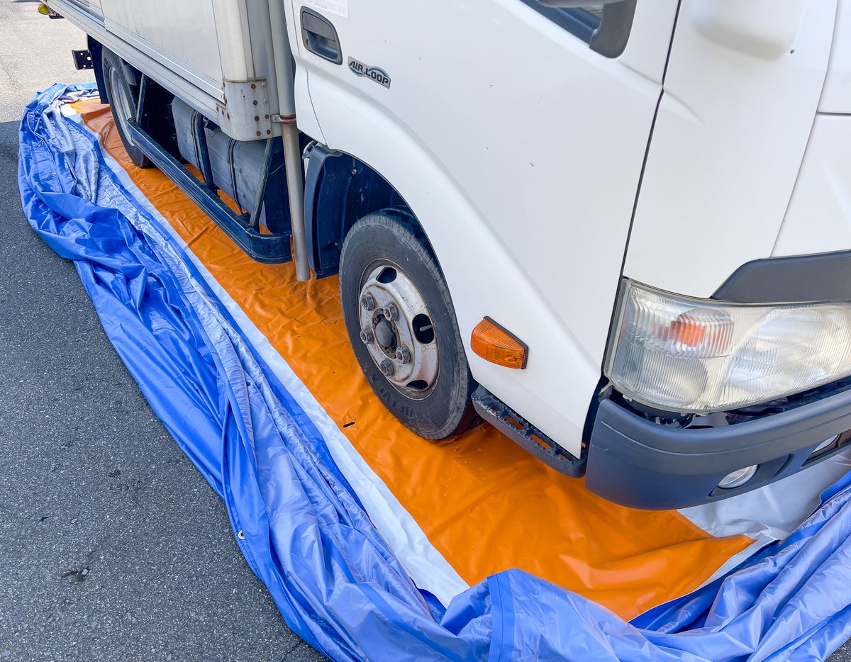 商品の特長としては、イノベックス国内自社工場で製造する耐水性と破れにくさに優れた特殊なシートを使用し、耐浸水性を圧倒的に高めております。また、トラックなどの商用車を多数所有する事業者での使用も想定し、浸水害が発生するまでの限られた時間で対策が取れるよう、車両1台あたり数名にて数分での取り付けが可能な設計としました。