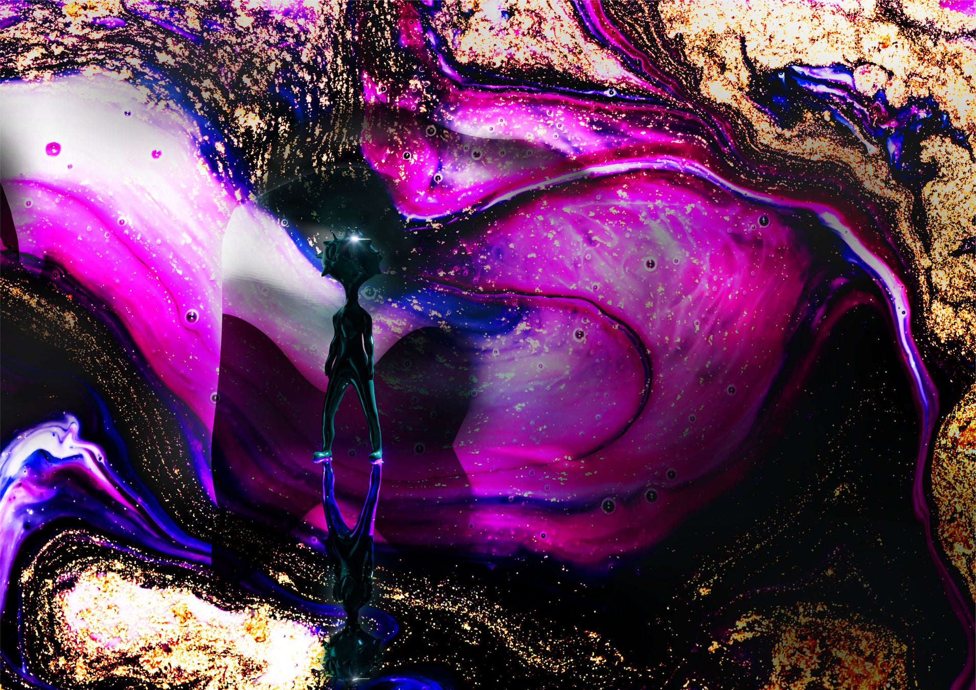 フィクションの中だけに描かれていた“宇宙人”を、DNA合成技術を用いて現実世界に顕現させるという、人類初の試みによって誕生しました。まるで異星からやってきたような幻想的な姿を持ち、その身体は見る角度や環境の光によって繊細に表情を変えます。