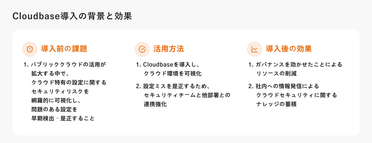 また、「Cloudbase」から提供されるドキュメントやサポートを活用することで、個々の運用者が自身でセキュリティ課題を解決しやすくなったことから、全体運用の負荷が低減されている他、パブリッククラウドのリスク状況をよりわかりやすく把握できるようになったことで、更なるガバナンスの強化が実現しています。