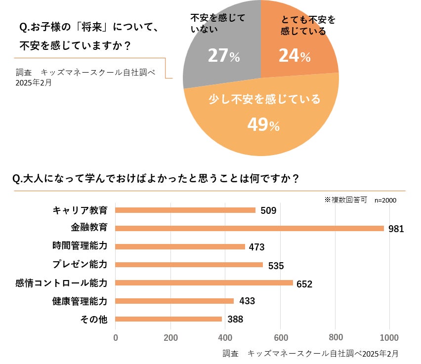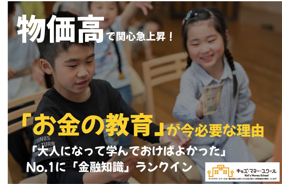 キッズ・マネー・スクールを運営する一般社団法人 日本こどもの生き抜く力育成協会(代表理事:三浦康司、東京オフィス:東京都港区新橋)は、2025年2月に子育て世代を対象としたアンケート調査を実施。その結果、「大人になって学んでおけばよかった」の質問の回答に「金融知識」がランクインするなど、子育て世代が抱えるお金への不安感が、子どもの将来への不安・金銭教育への関心の高まりに繋がってることが明らかになり、キッズ・マネー・スクールへの問い合わせ増加の背景が改めて浮き彫りとなりました。