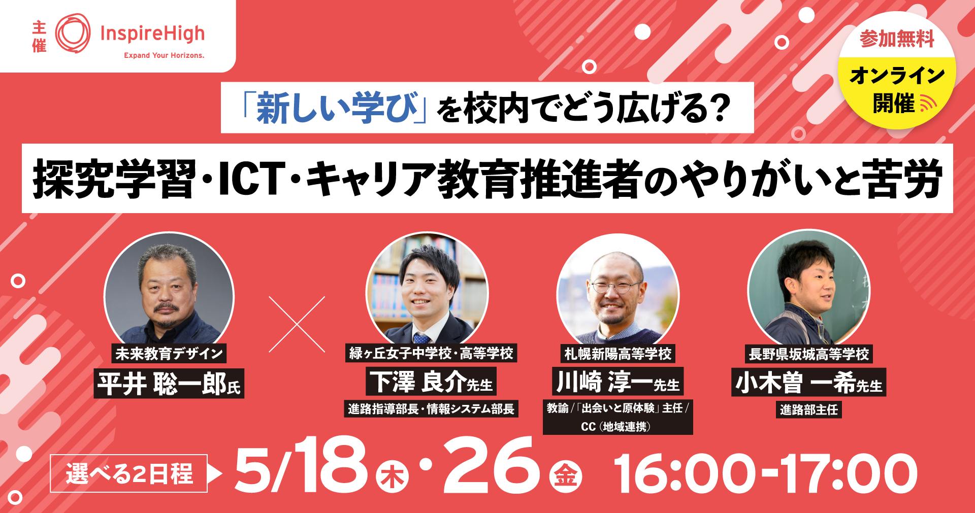 5月18日(木)・26日(金)の2日程、「新しい学び」を校内で広げる実践者の先生たちに登壇いただきます。
