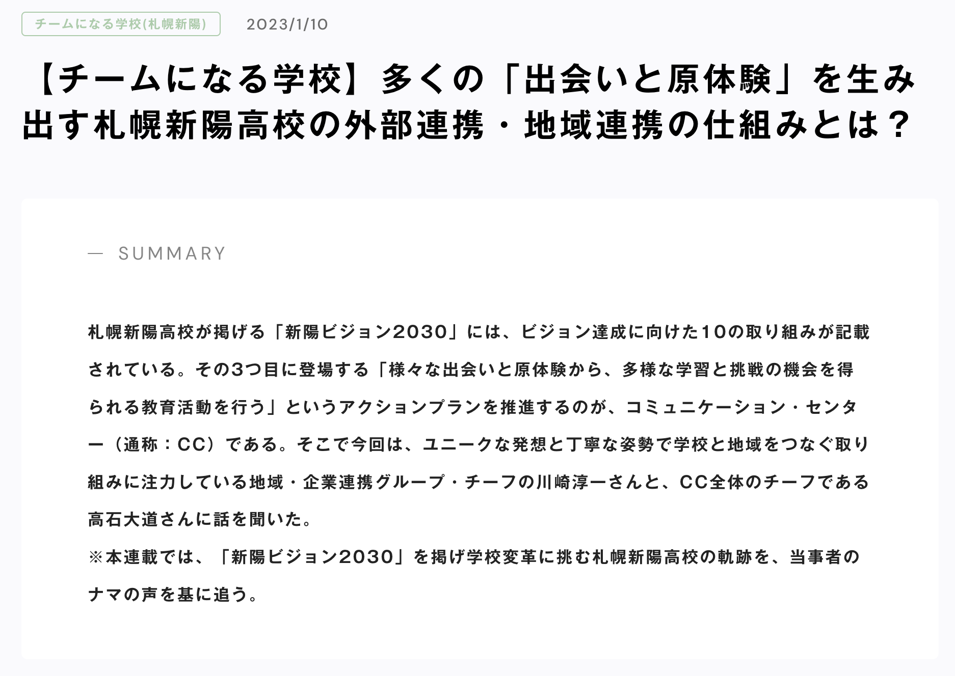 【チームになる学校】多くの「出会いと原体験」を生み出す札幌新陽高校の外部連携・地域連携の仕組みとは?