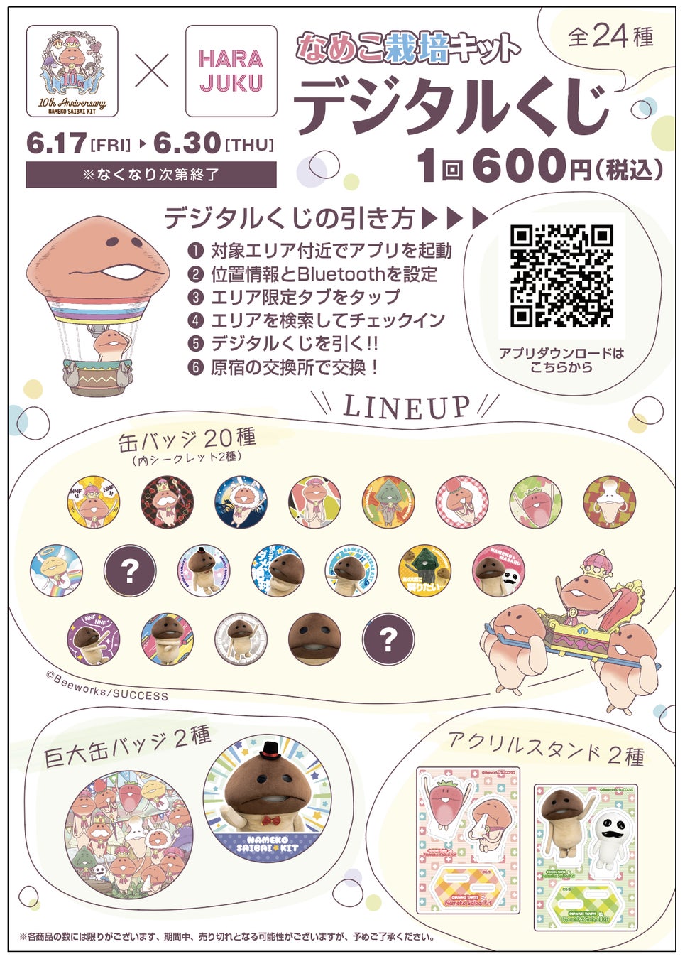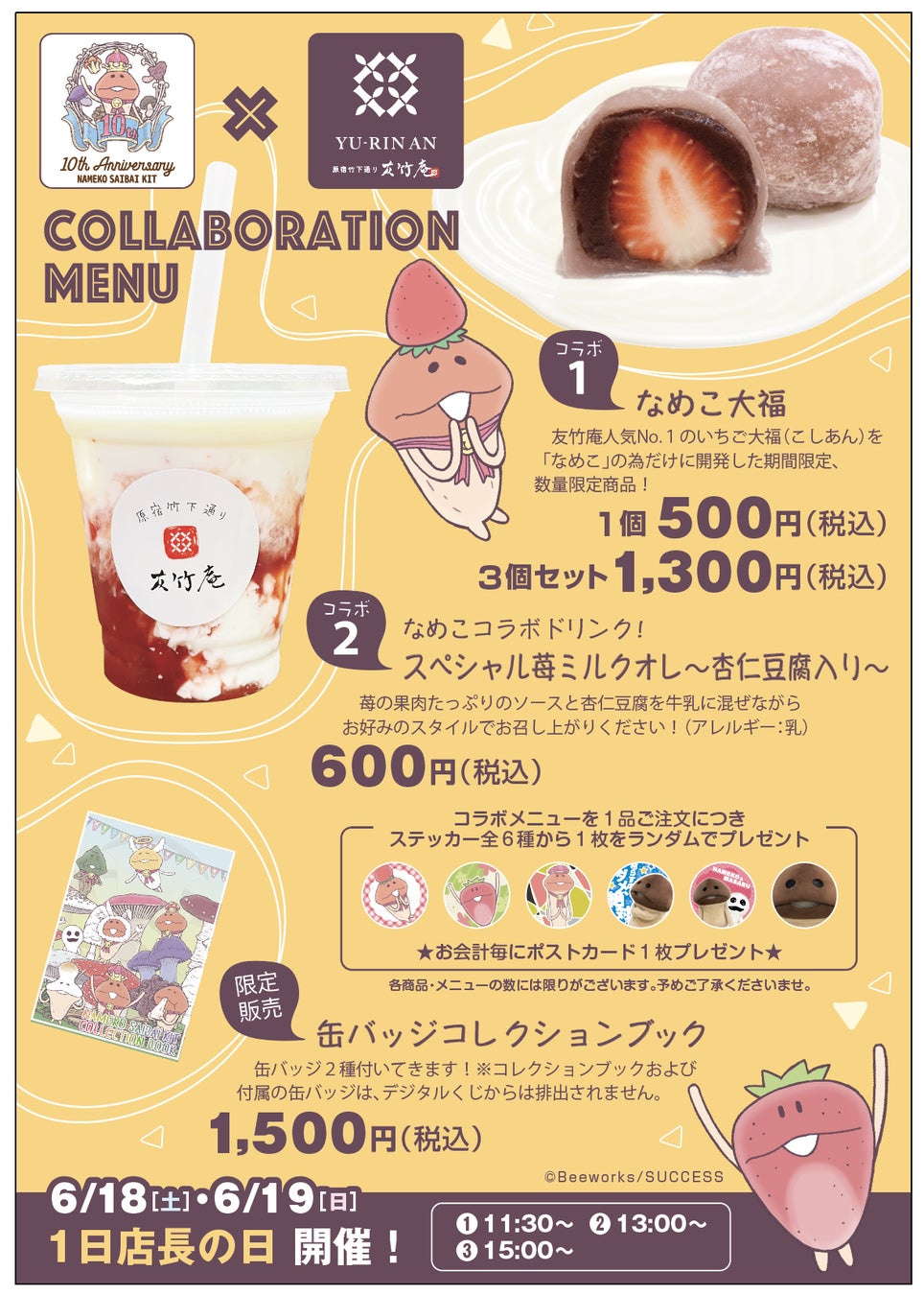 AppBank株式会社(本社:東京都新宿区、代表取締役社長CEO:村井 智建、証券コード:6177)は、 AppBankが企画制作したスマートフォン向けアプリ「HARAJUKU」と、村井智建(マックスむらい)がプロデューサーを務める旗艦店「原宿竹下通り友竹庵(以下、友竹庵)」において、6月17日から6月30日の期間、スマホアプリで人気となったキャラクター「おさわり探偵 なめこ栽培キット」シリーズ(以下「なめこ栽培キット」)とコラボレーションすることを本日6月8日に発表いたしました。コラボレーション期間中は、「HARAJUKU」では「缶バッジ」や「アクリルスタンド」が当たるデジタルくじを、 「友竹庵」ではノベルティステッカー付きのコラボメニュー「なめこ大福」「スペシャル苺ミルクオレ〜杏仁豆腐入り〜」を販売いたします。また、コラボレーションを記念して、「友竹庵」店頭にてなめこの1日店長を6月18日と6月19日に実施するほか、「CUTE CUBE HARAJUKU」にて10周年イラストの壁面ジャックを行います。