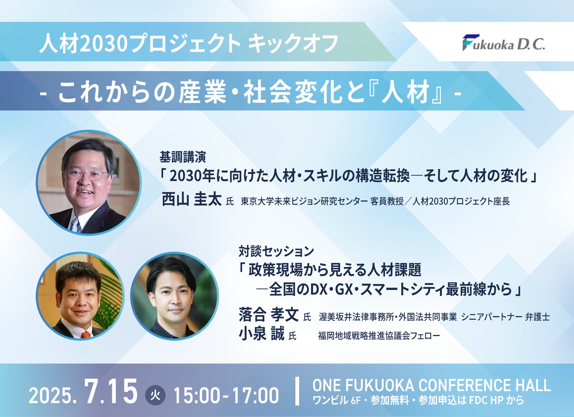 福岡地域戦略推進協議会(以下 FDC)は、2025年度事業計画を踏まえ、FDCとして中長期的な人材戦略の検討と、それを基盤とした事業の具体化を進めるため、「人材2030プロジェクト」を開始するとともに、7月15日(火)にキックオフイベントを開催しますのでご案内申し上げます。