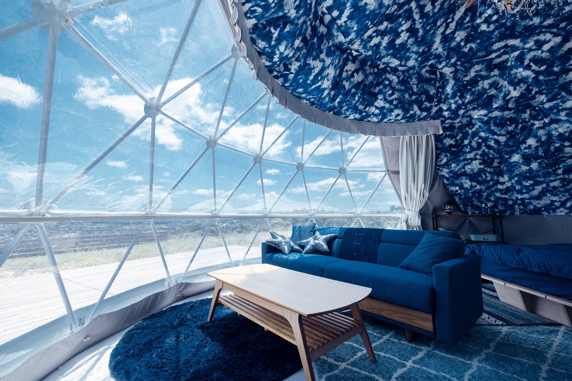 【デニムをテーマにしたグランピングドーム】藍色のラグジュアリー空間の全貌とは?!昼と夜で異なる表情が魅力!プレミアムドーム-藍-が一挙公開!