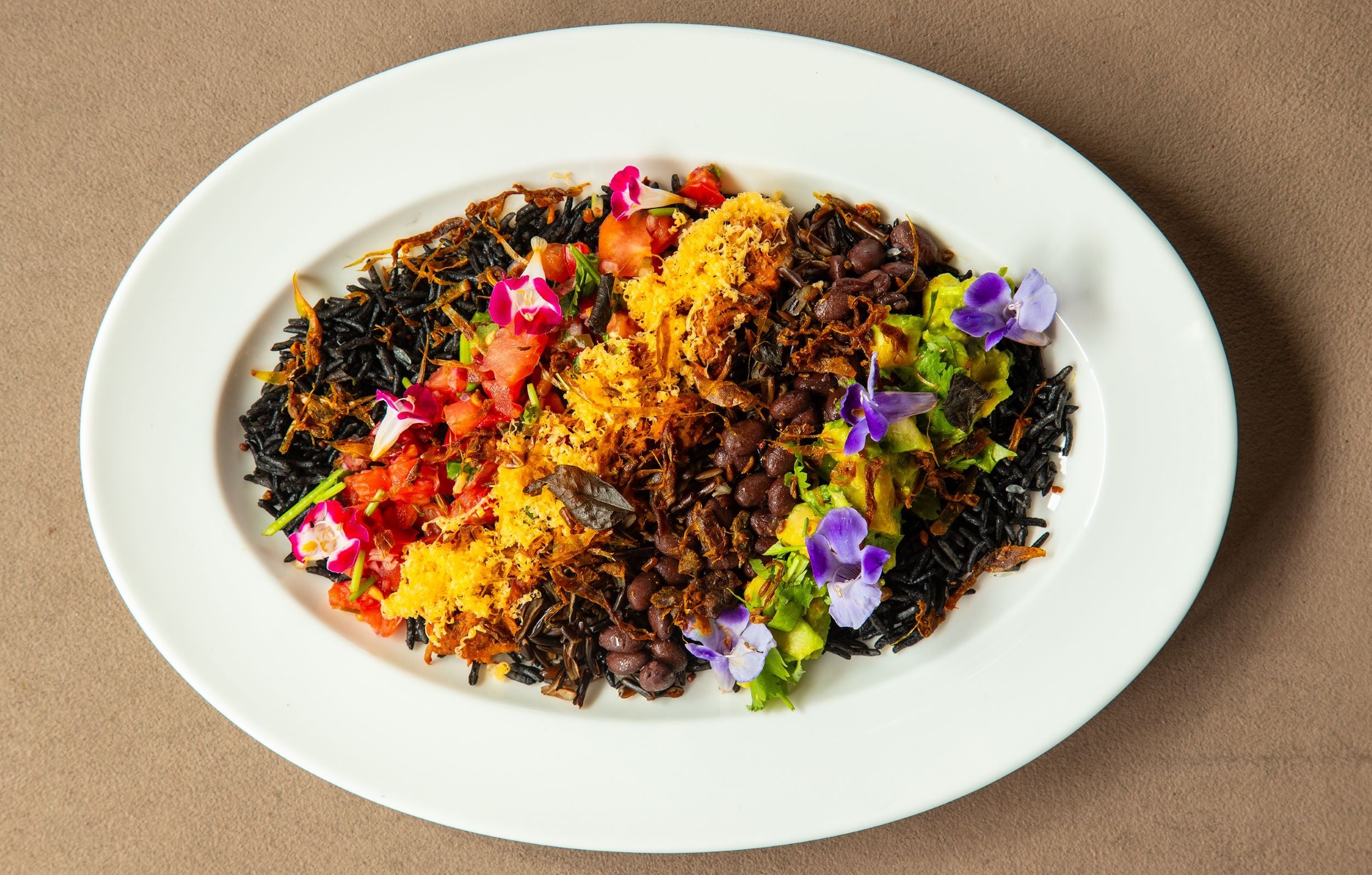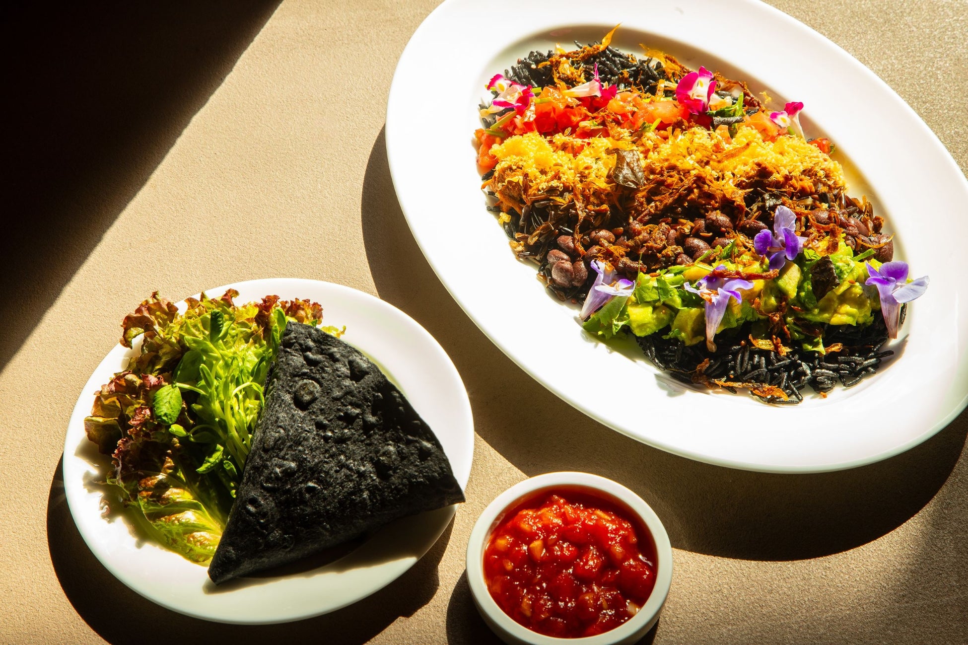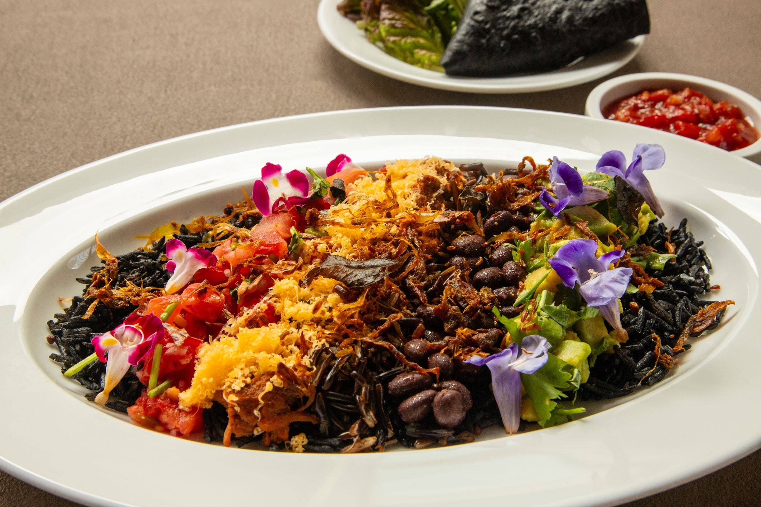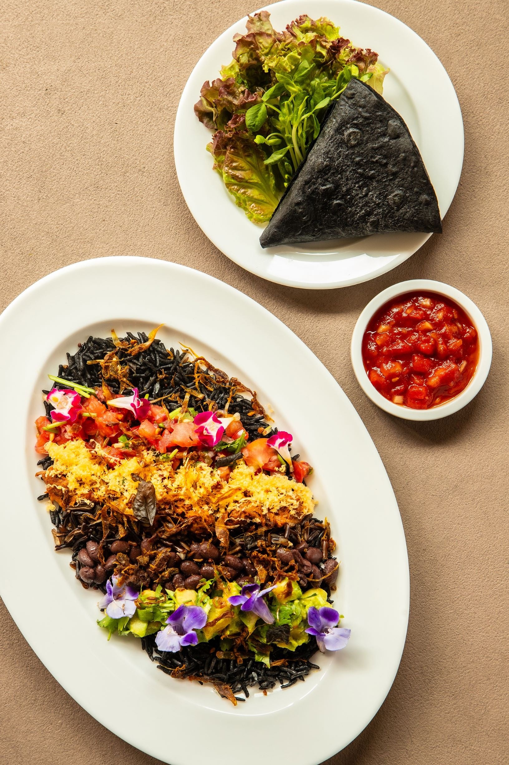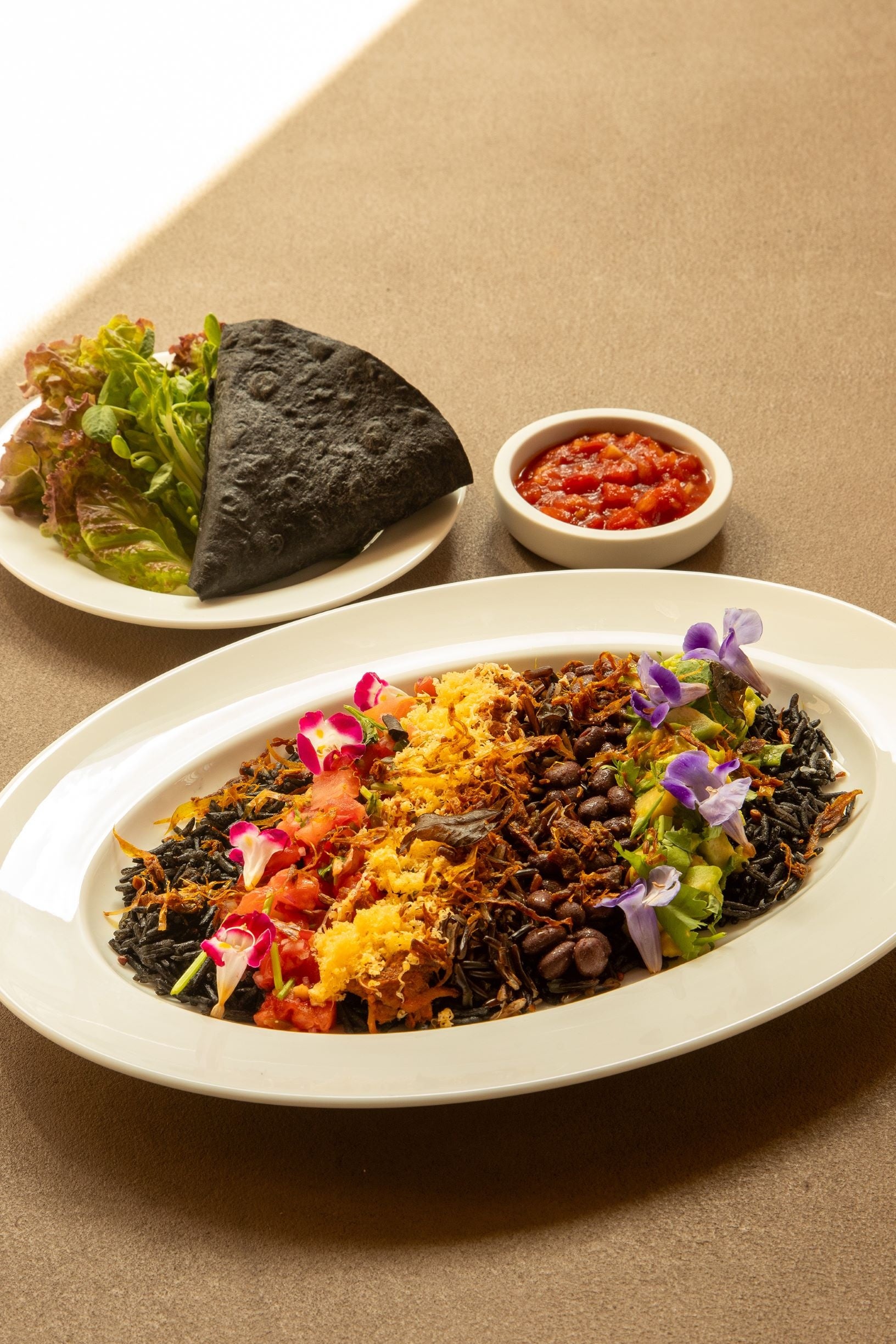 ブラック・ライム・ライスとブラック・ビーンズの深い黒、カルニタスとピコデガヨの鮮やかな赤、ワカモレとエディブル・フラワーの柔らかな青が一皿に調和し、繊細かつ洗練された印象を与える。スモーキーで複雑な香りを持つスパイス・ブレンド(バドゥーヴァン)と、燻製唐辛子のチポトレ・ソースが、まろやかな甘みと鋭い辛味を融合させ、大胆でワイルドな味わいを生み出す。さらに、そのままボウルとして楽しむだけでなく、別添えのブラック・トルティーヤで自分好みにアレンジすることで、新しい食体験を楽しむことができる。