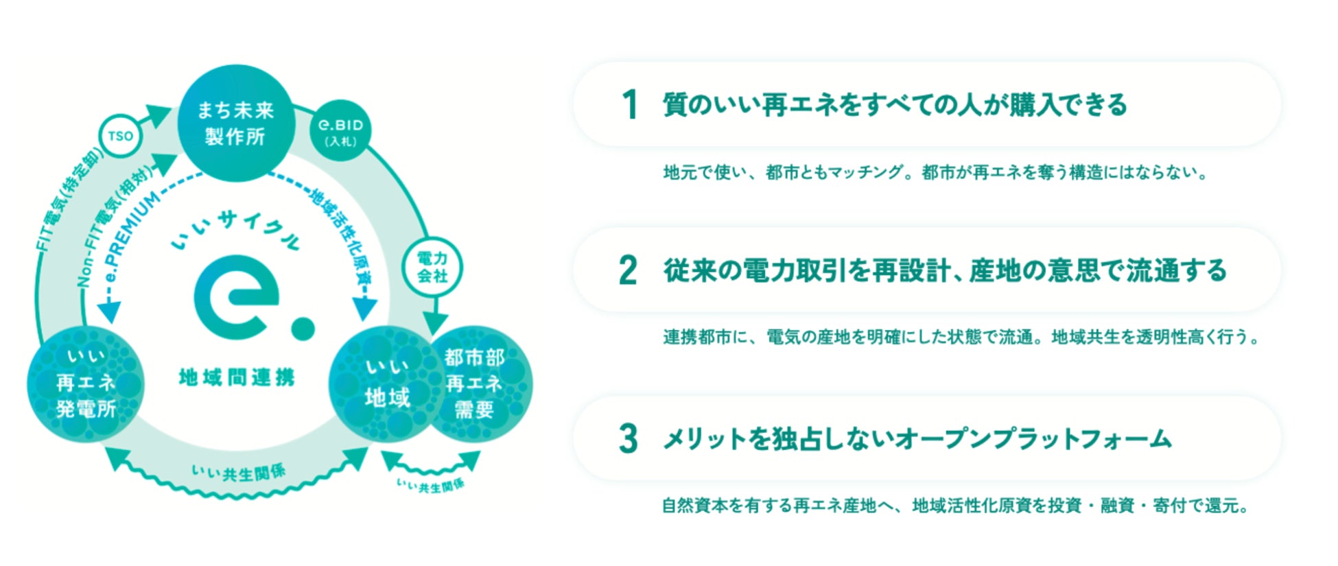 まち未来製作所は、地域を再生する再生可能エネルギー“地域再エネ”の地産地消と地域間流通により地域活性化を実現することを目的に、再エネアグリゲーションプラットフォーム「e.CYCLE(いいサイクル)」を開発・提供しています。