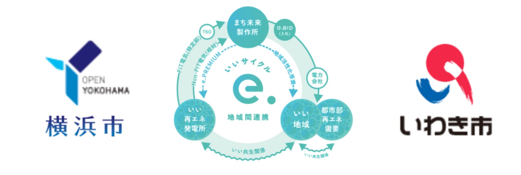両市は、再エネアグリゲーションプラットフォーム「e.CYCLE(いいサイクル)」を活用し、いわき市で創出された再生可能エネルギーの余剰分を横浜市に供給する仕組みを構築しました。横浜市といわき市は、再エネの活用による脱炭素社会実現と地域活性化を目指し、相互に連携をして取り組んでいきます。