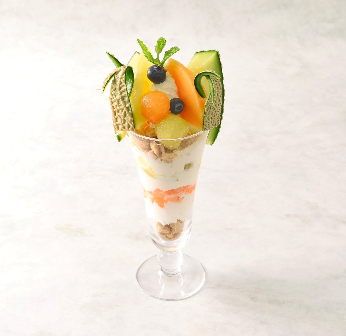 2種類の国産メロンをたっぷり使用した季節のパフェです。みずみずしくジューシーな旬のメロンの美味しさをご堪能ください。