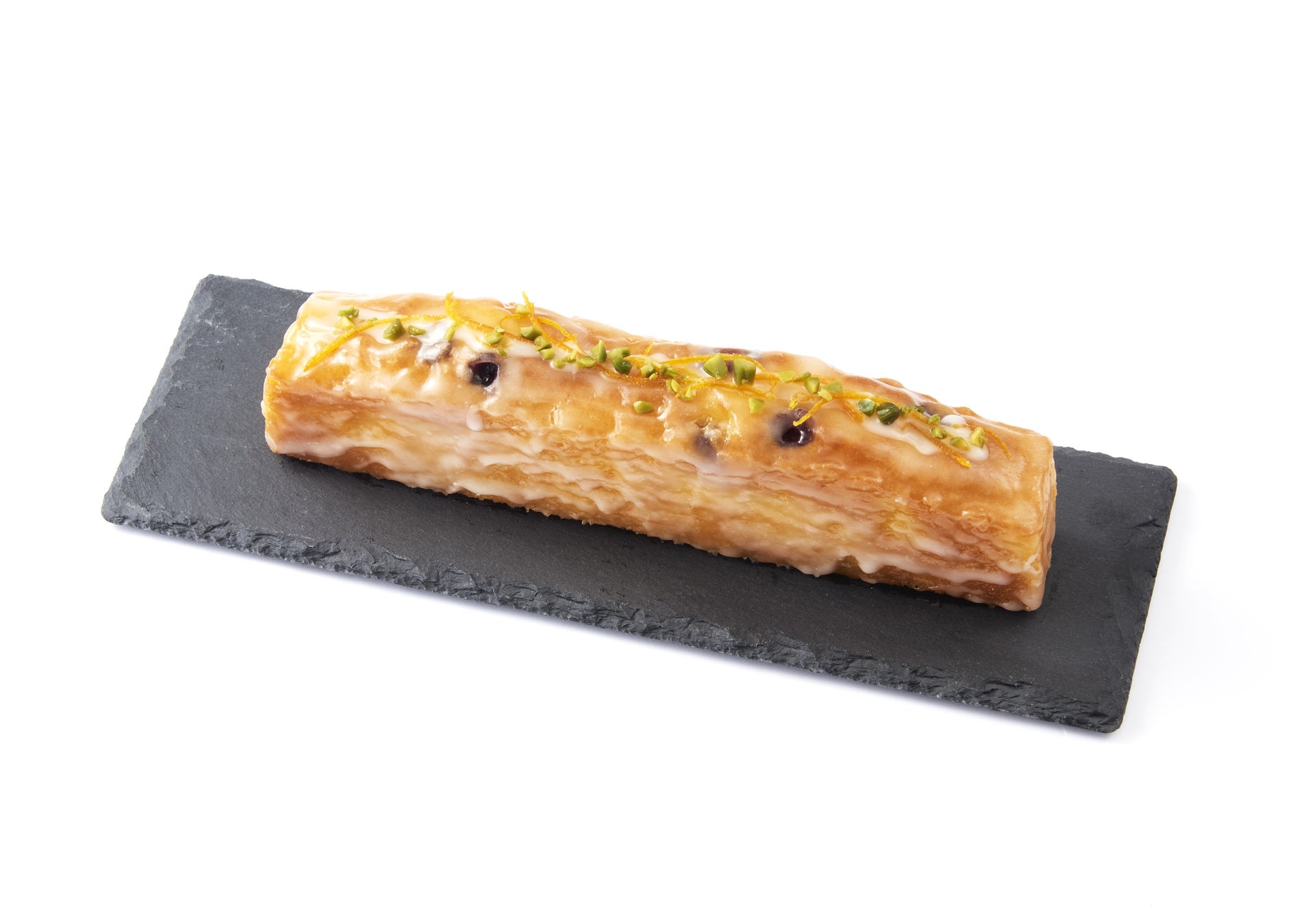 発酵バター、卵、砂糖、小麦粉、アーモンドの生地に瀬戸内レモンの皮をすりおろしたゼストを加え、しっとりソフトに焼き上げました。食感のアクセントとして自家製のクランベリーシロップ煮を加えています。仕上げにアプリコットジャムとレモン風味の糖衣を纏わせた、爽やかなフランスの伝統菓子です。
