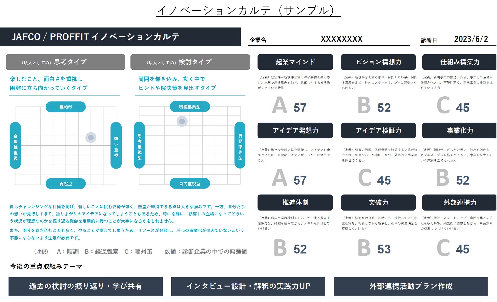 新規事業に取り組む上で必要な「起業マインド」「ビジョン構想力」「アイデア検証力」など9個の観点から自社の新規事業の推進力や取組みレベルを数値化。大企業数十社の検討状況と比較したデータから自社の状況を客観的に判断できるだけでなく、「今、優先して取り組むべきこと」まで知ることができます。