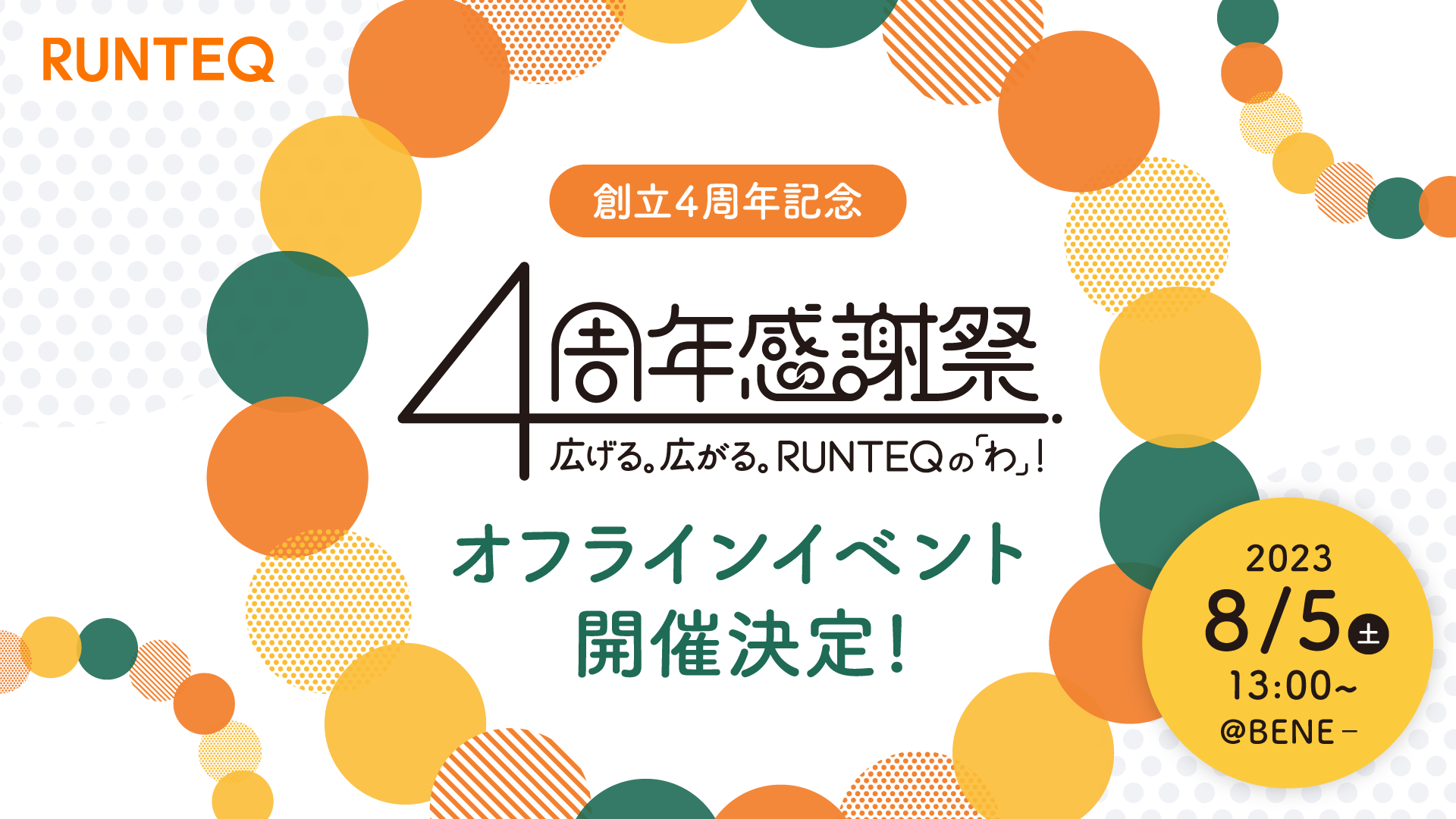 そんなRUNTEQから日頃の感謝を込めまして、4周年を記念した特別イベント「4周年感謝祭 〜広げる。広がる。RUNTEQの"わ"!〜」と「#ありがとうで振り返るRUNTEQキャンペーン」を開催いたします。
