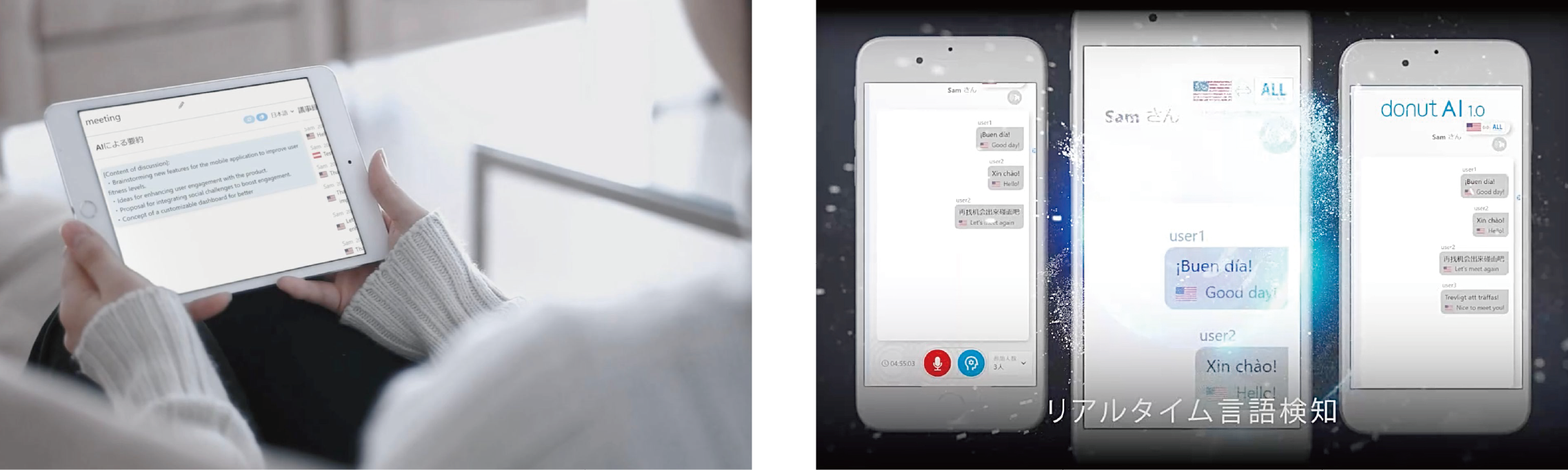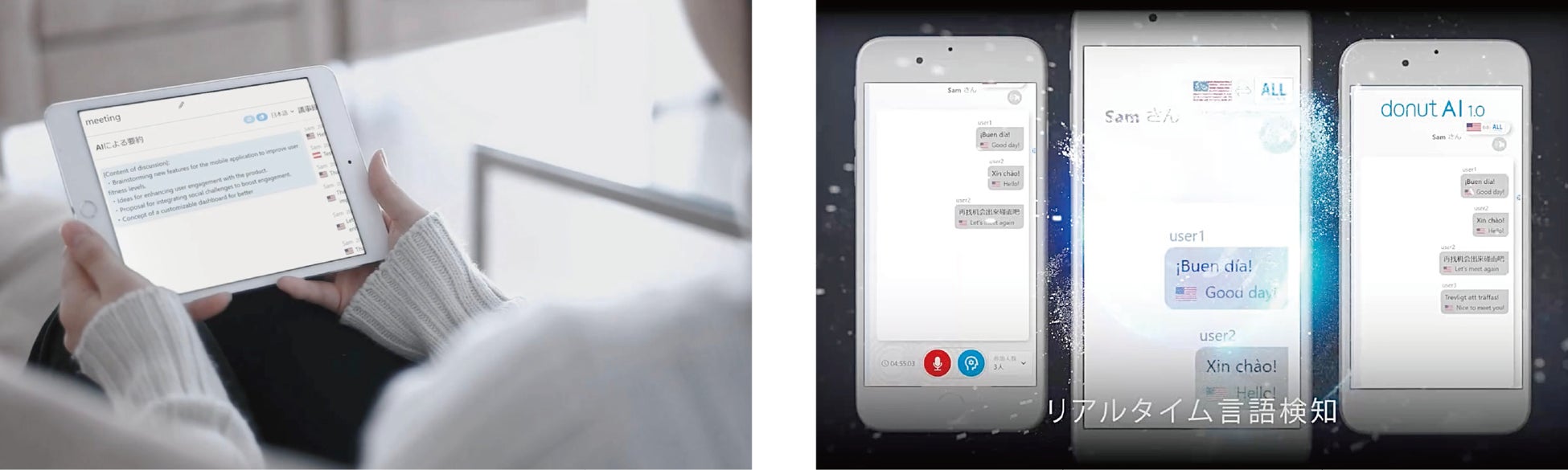 また、リアルタイム文字起こし、リアルタイム話者分離、自動言語選択、100か国語 翻訳などを高精度で行える会議システムです。
