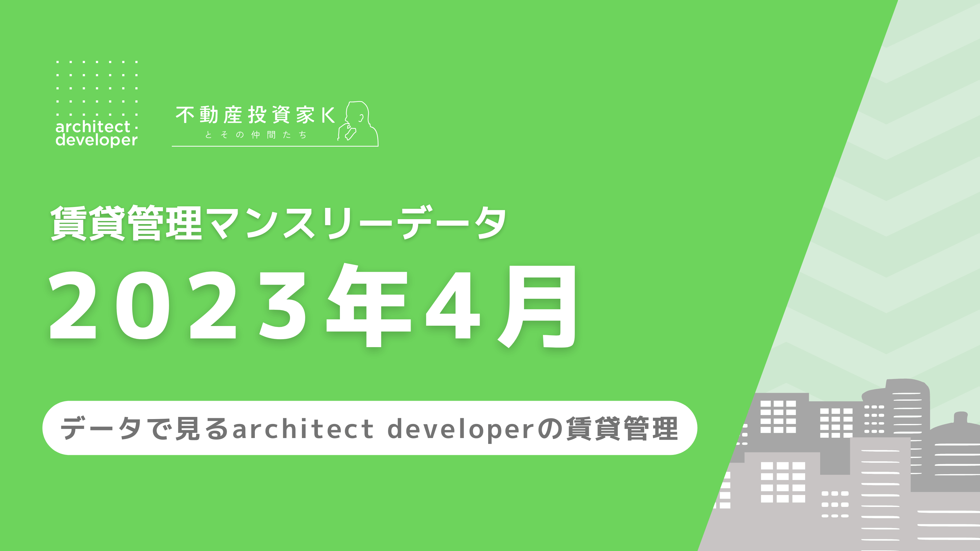 architect developerが管理している集合住宅の賃貸管理状況を、毎月20日頃に「マンスリーデータ」として配信しています。賃貸管理データを定期的に公開することで事業の透明性を高め、オーナーさまや投資家の皆さまをはじめとする多くのステークホルダーの皆さまに、当社の事業内容や取り組みを知っていただく機会としていただければと考えております。より詳しいマンスリーデータ(2023年4月)は、不動産投資メディア「不動産投資家Kとその仲間たち」よりご確認いただけます! https://www.investor-k.com/media/report/a173