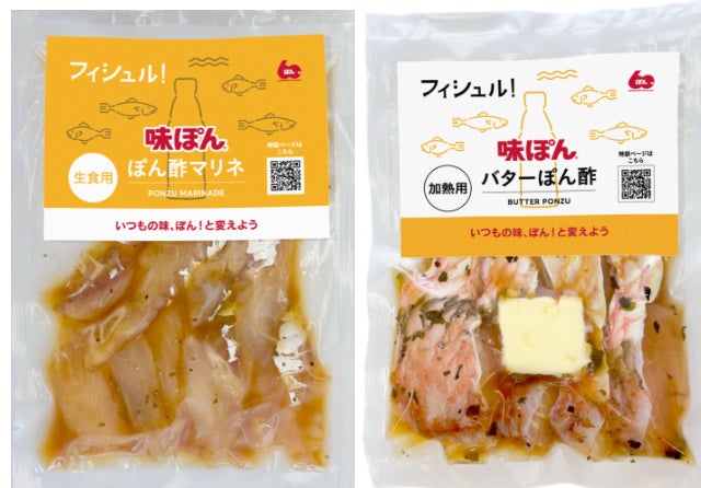 コラボレーションの企画として、味ぽんと旬の未利用魚を使った限定パック「ぽん酢マリネ(生食用)」「バターぽん酢(加熱用)」のコラボ商品を開発いたしました。ミールパック解凍後、生食用はそのまま、加熱用はお好きな加熱方法で火を通していただくだけで簡単に美味しくお召し上がりいただける商品です。