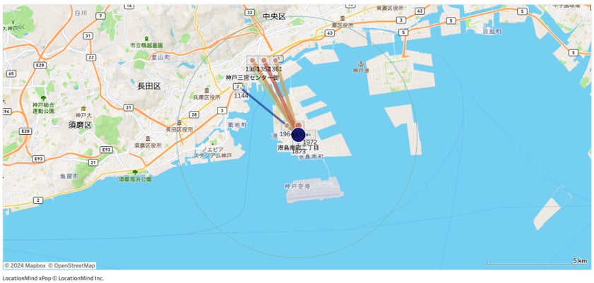 <参考:OD範囲でODいずれかに「神戸市中央区港島南町2丁目」を含み、且つ、 時間帯を17:15~17:30に絞り込み表示した場合>