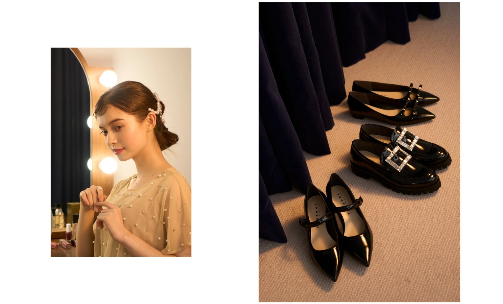 ポインテッドトゥで表現されたメリージェン、細く華奢なリボンのフラットパンプス、足元を華やかに魅せるビジューローファーなど、フェミニンでありながら、儚さ纏うエレガントな雰囲気を感じていただける秋冬コレクションです。