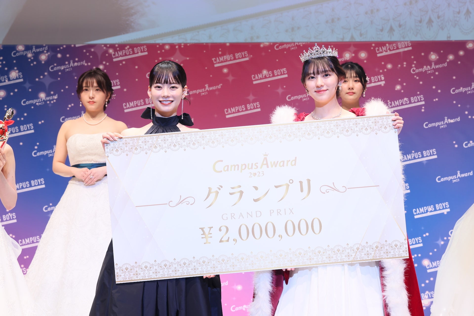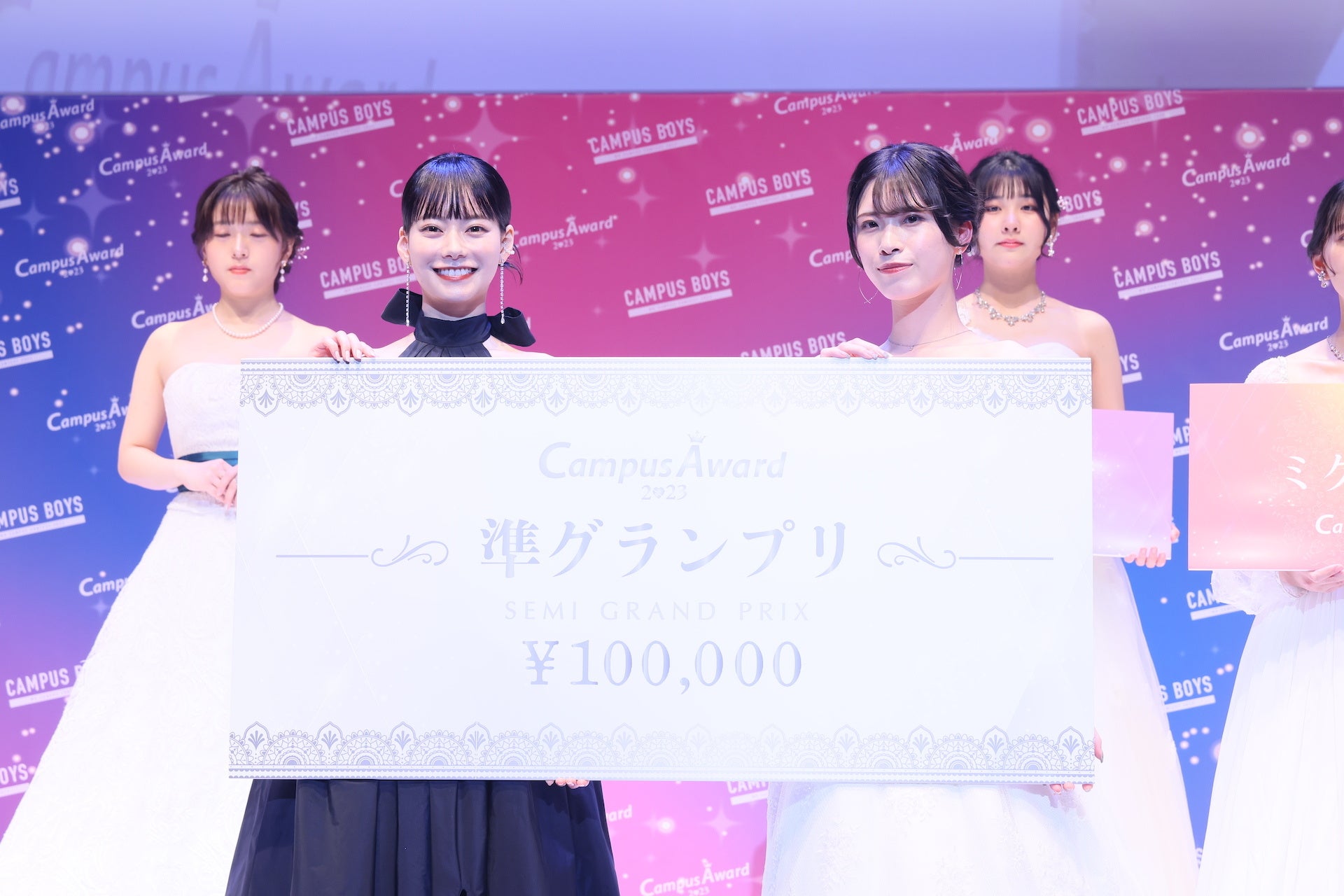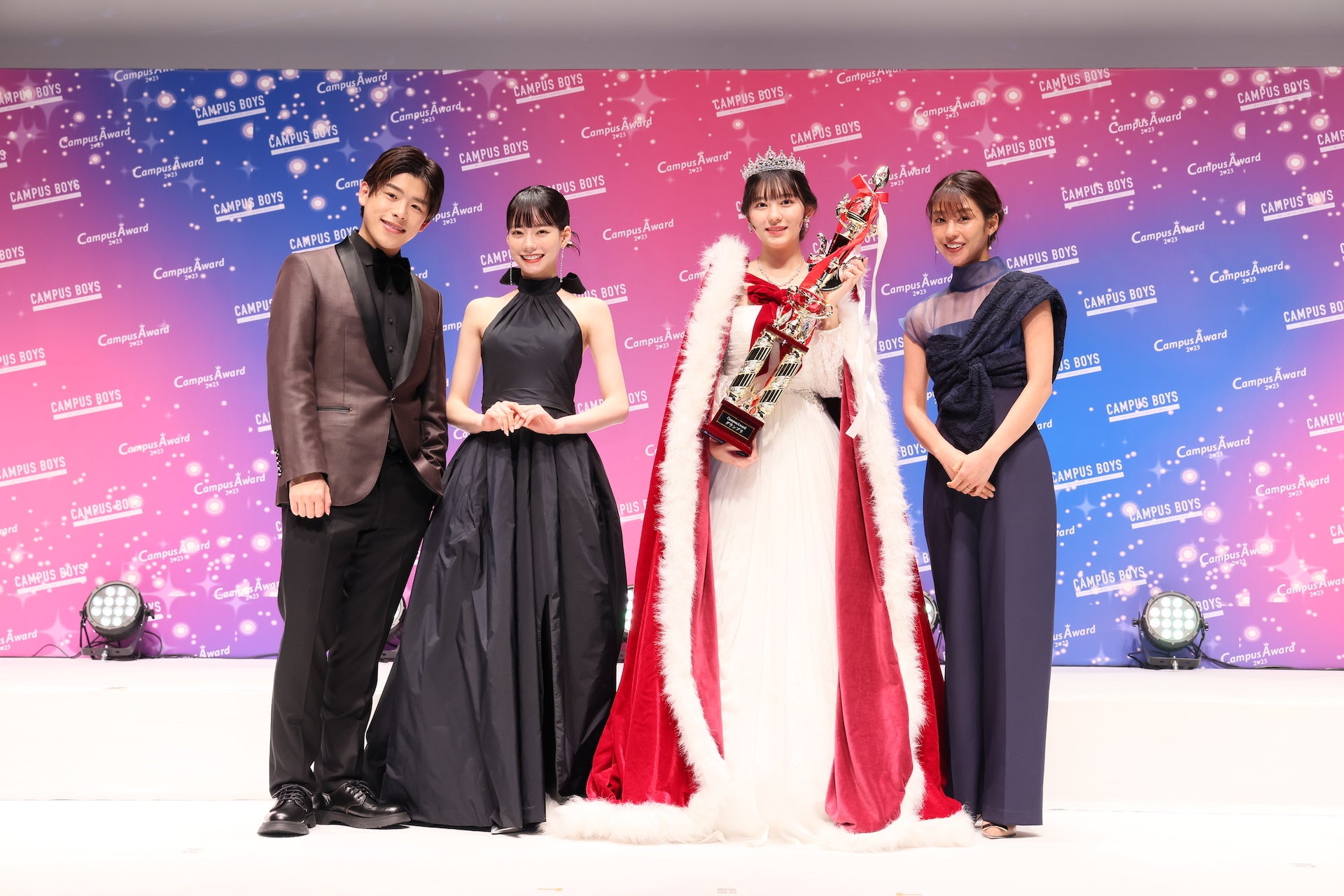 表彰式ではゲストMCのこーくんと応援アンバサダーのなごみさんのプレゼンターのもと「CampusAward2023」【グランプリ】にぽんずさんが選ばれ、ガウンとティアラ、トロフィーが授与されました。ぽんずさんは【ミクチャ賞】にも選ばれダブル受賞となりました。ぽんずさんは「今頂いたトロフィーとガウンとティアラでグランプリを実感しています。とても嬉しい気持ちと感謝の気持ちでいっぱいです。グランプリからの景色をみなさんと一緒に見ること、最高に輝いている自分を見てもらうことを目標に頑張ってきたので、ここまで応援してくださったみなさんと一緒に受賞できたグランプリだと思っています。本気の私を本気で応援してくれてありがとうございました。みなさんへの感謝を胸にグランプリを噛み締めたいです。」とCampusAwardへの想いや応援してくれた方への感謝を語りました。グランプリには、賞金200万円、「GirlsAward」ランウェイ出演権、有名雑誌掲載権など豪華特典が贈られました。ぽんずさんの憧れの人はなごみさんと公言し、写真撮影の時にはこーくんから「似てる!姉妹みたい!」と笑いを誘いました。
